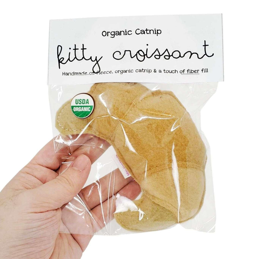 Cats think these croissants are as yummy as they look! We hand cut and sew each croissant toy out of a gorgeous mottled fleece that we layer and fill them with over 1/4 cup of organic catnip. Each looks baked to perfection and is slightly bigger than a real croissant. HANDMADE VEGAN ORGANIC Handmade in the San Francisco Bay Area.