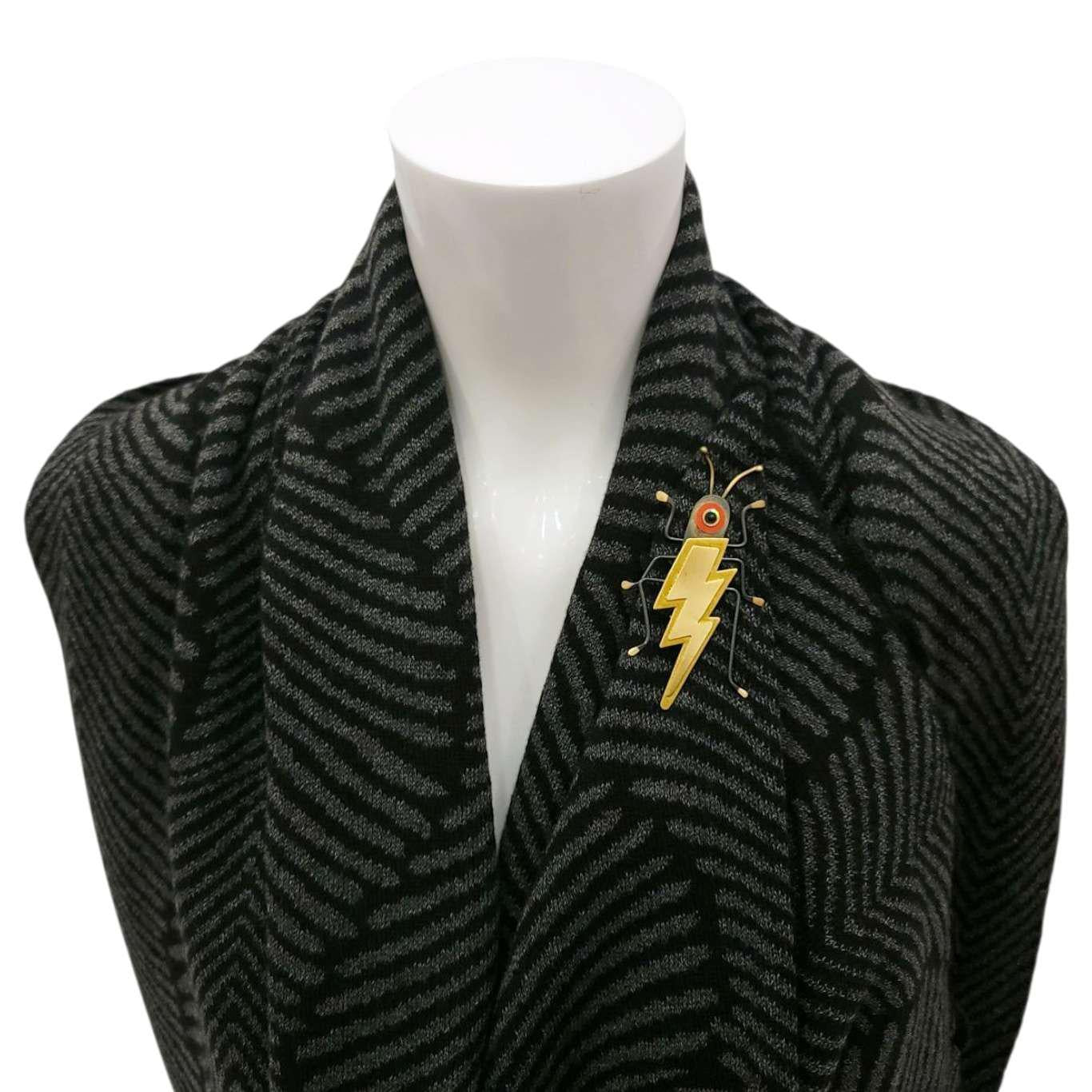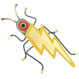 Need a little boost? This lightning bug pin is ready to zap you into action! Pin is made of antiqued brass with celluloid head decorations, glittery glow-in-the-dark enamel, and free-swinging legs.