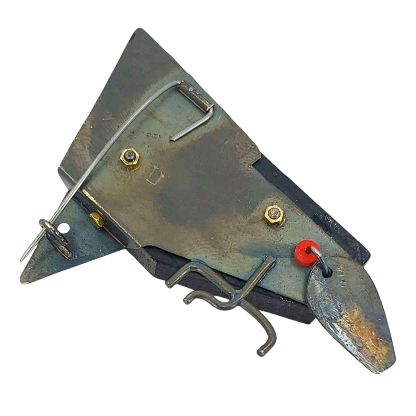 A one-of-a-kind spotted woodpecker made from an altered wooden domino, accented with brass and enamel, a moving tail, and a big epoxy resin eye is ready to adorn your collar and bring compliments your way!