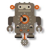 Beep, boop, bop! This friendly robot is ready to compute the time, with a loose gear that dances in silent rhythm to add a byte of fun to your wall.