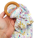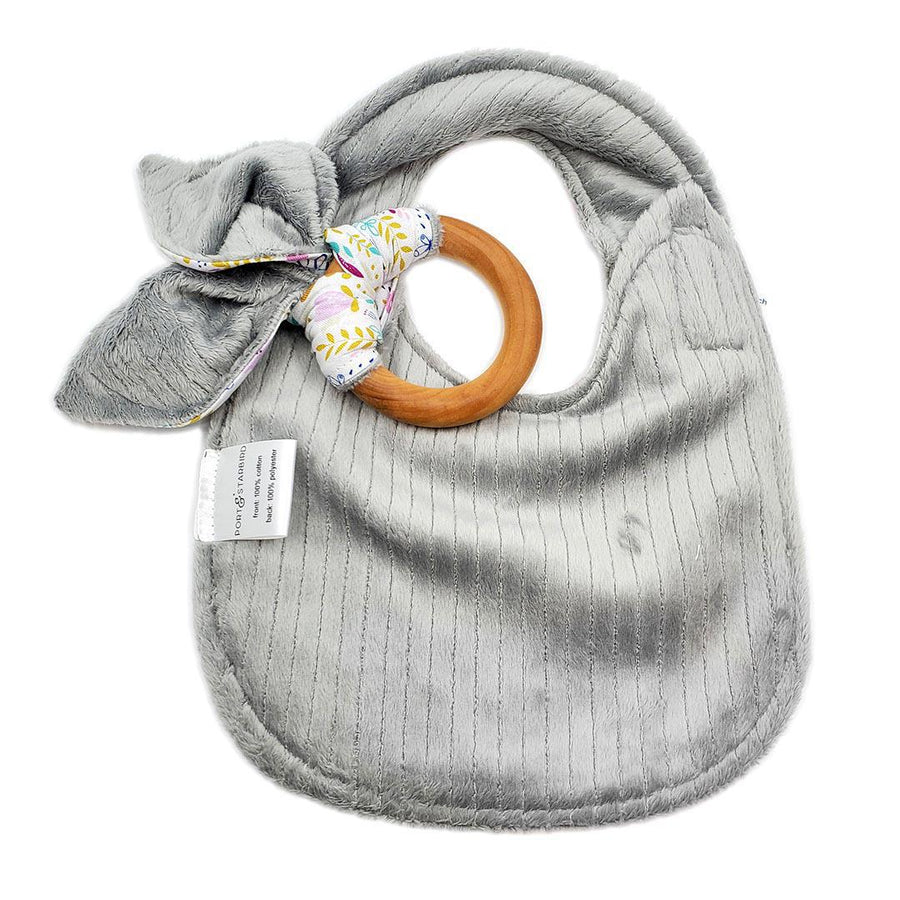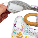 This white floral bib and teething ring make the perfect baby shower gift set! The super cute and totally functional side-closure bib will be your go to for daily feedings and drool sessions, while the wooden teething ring does double duty as a sensory toy with its crinkly inner layer and super soft snuggly backing.