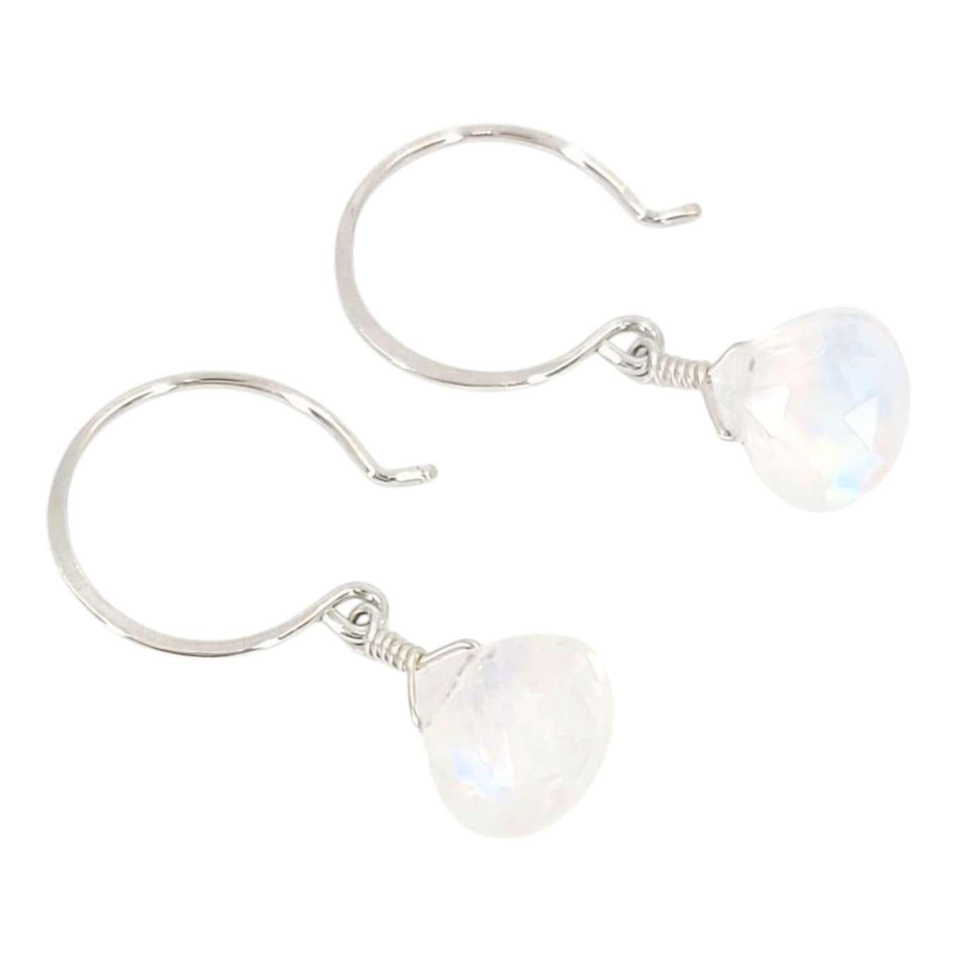 These sweet little earrings feature faceted teardrops of genuine rainbow moonstone suspended on circular sterling silver ear wires.
