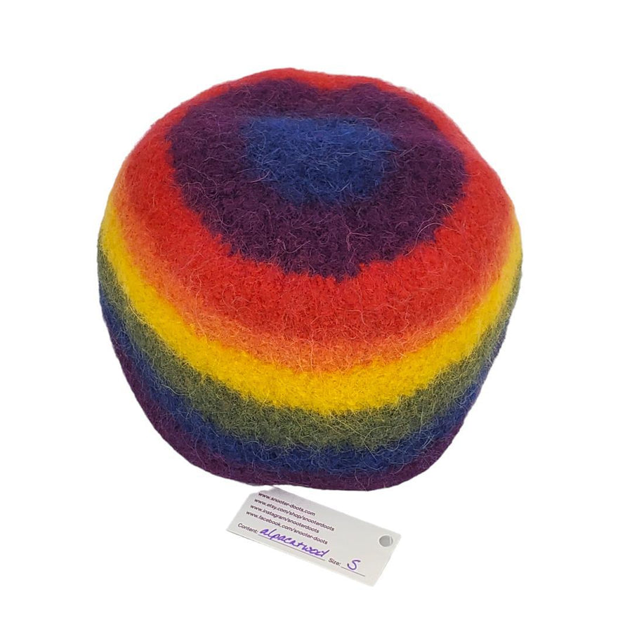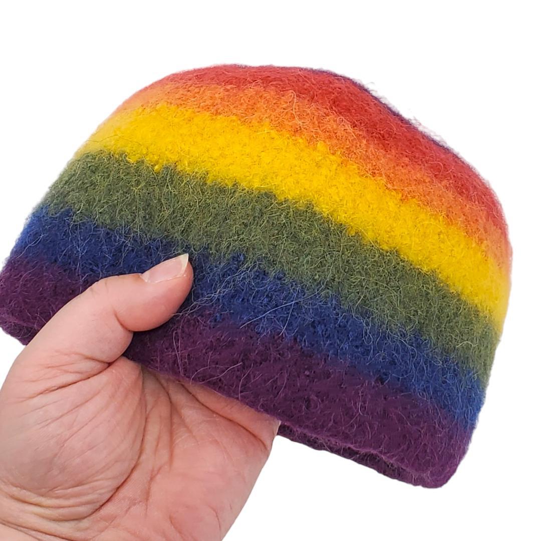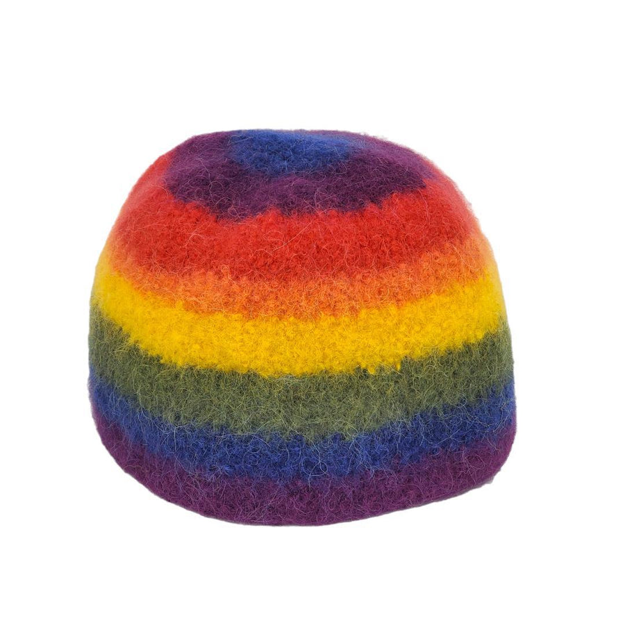 A playful hand-knit and fulled (wet felted) rainbow hat made of 100% wool to keep your head nice and warm!