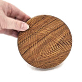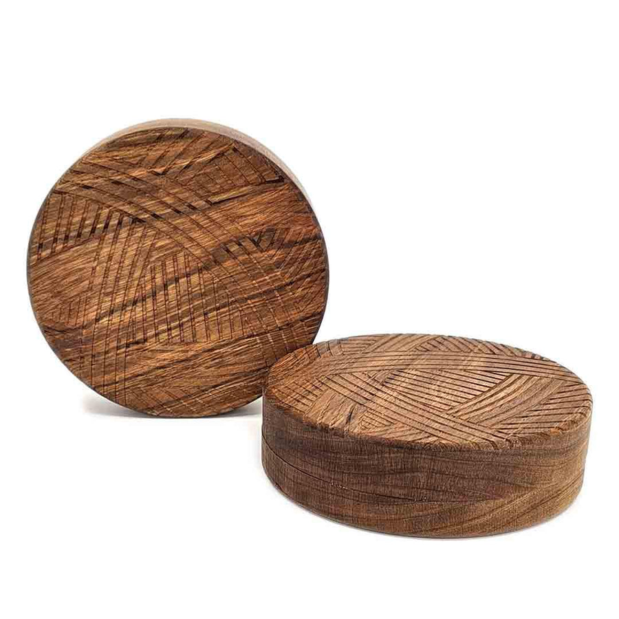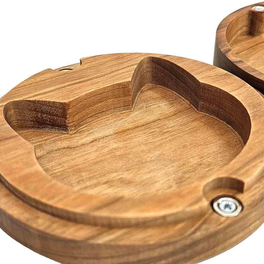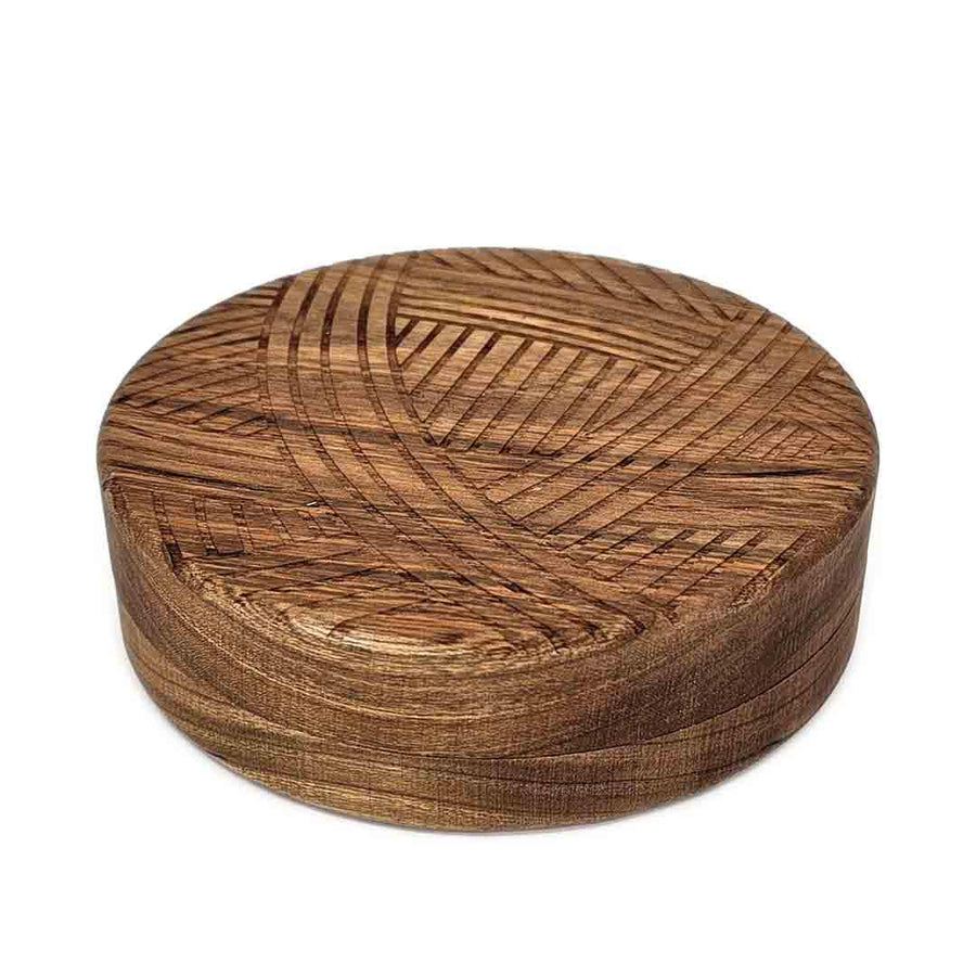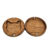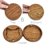 This sturdy round medium cherry hardwood box is engraved with a yarn motif on the lid and has a cat head shaped storage space on the inside!