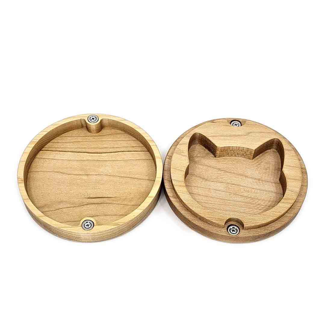 This sturdy round light maple hardwood box is engraved with a yarn motif on the lid and has a cat head shaped storage space on the inside!