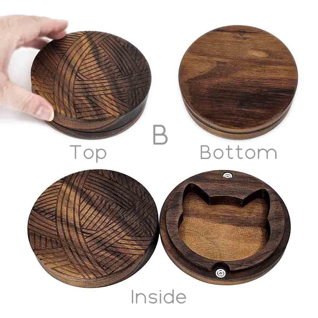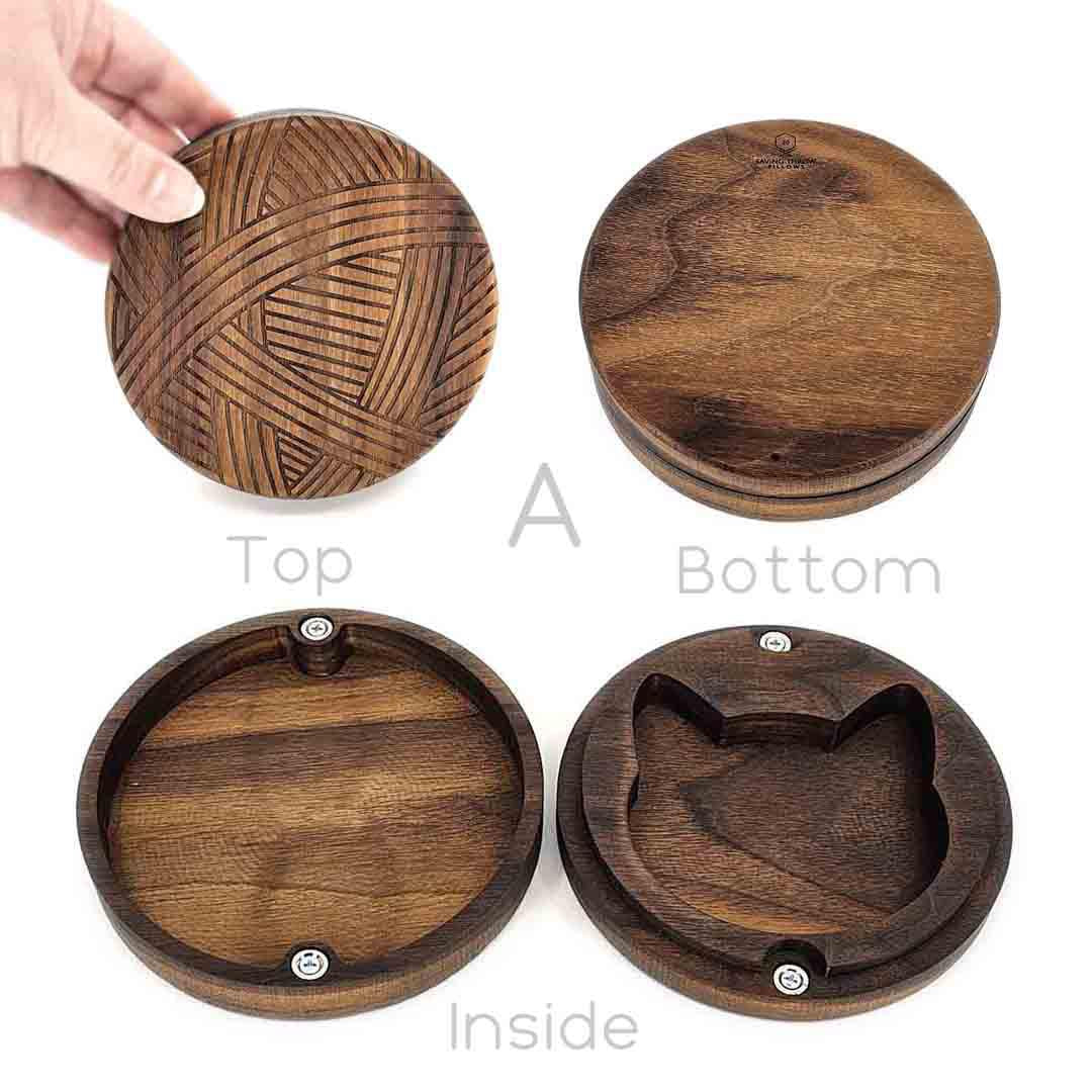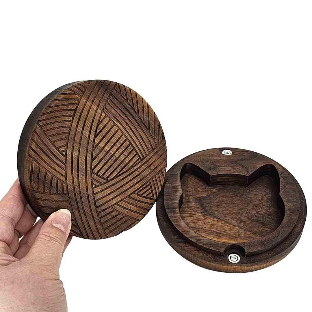 This sturdy round dark walnut hardwood box is engraved with a yarn motif on the lid and has a cat head shaped storage space on the inside!
