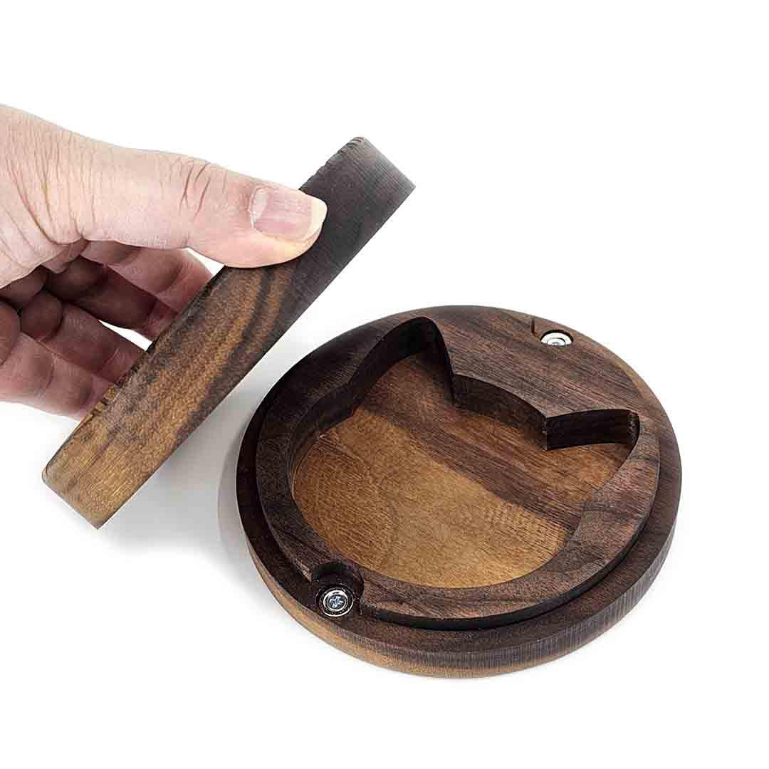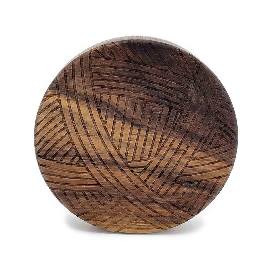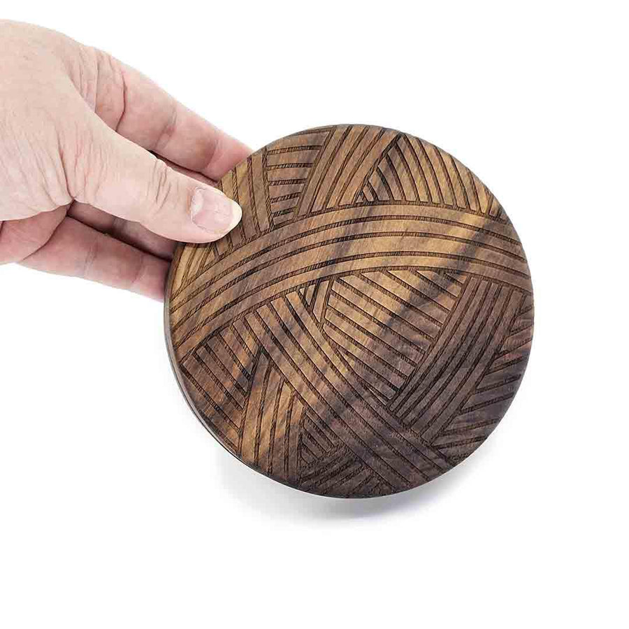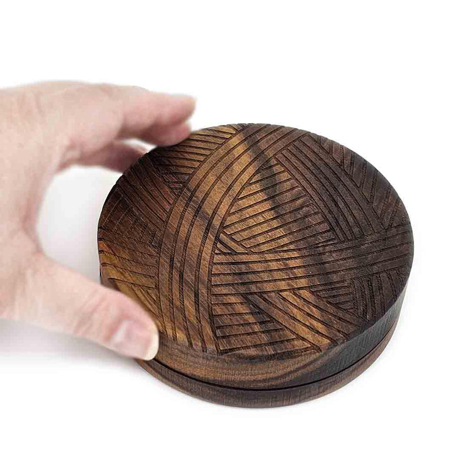 This sturdy round dark walnut hardwood box is engraved with a yarn motif on the lid and has a cat head shaped storage space on the inside!