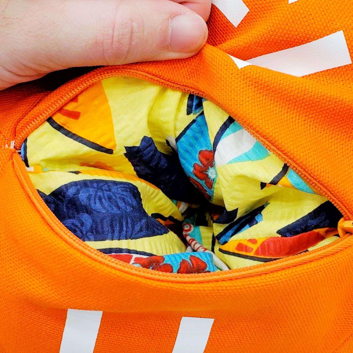 - Hidden zipper pocket features contrasting fabric (see variants for options)