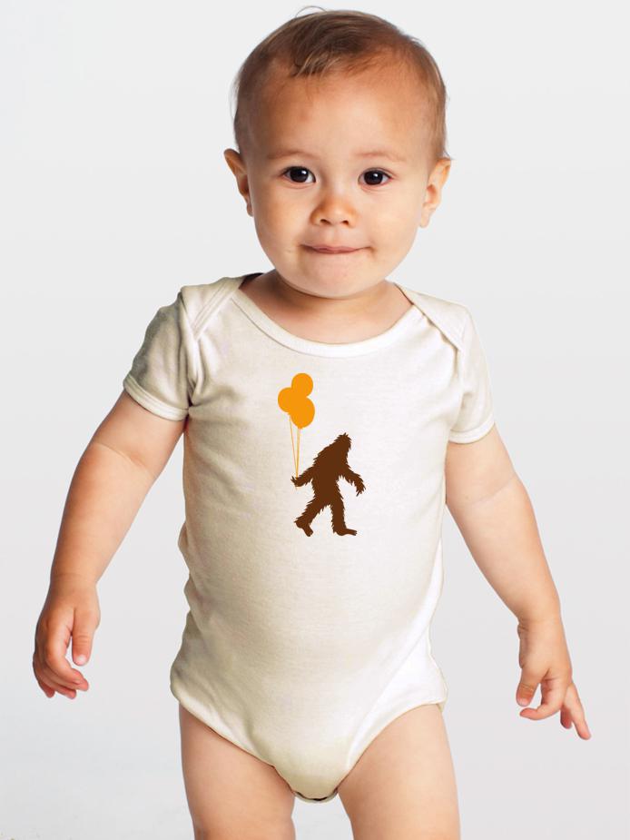 Original Orange Twist design of a friendly Sasquatch and his trio of yellow balloons is screenprinted with water-based ink onto a 100% organic cotton onesie.