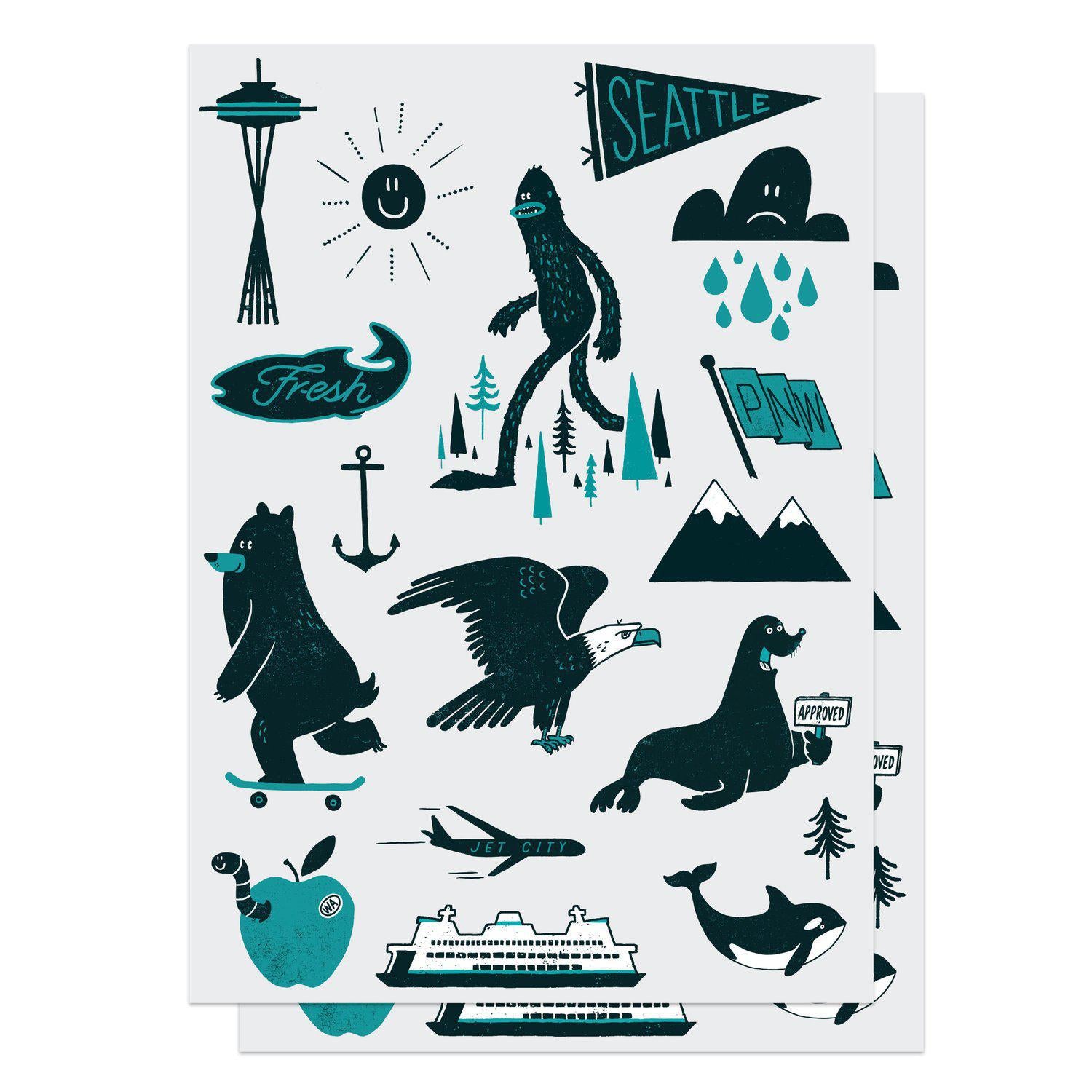 A particularly Pacific Northwest themed set of temporary tattoos designed and produced by the talented team at Factory 43!