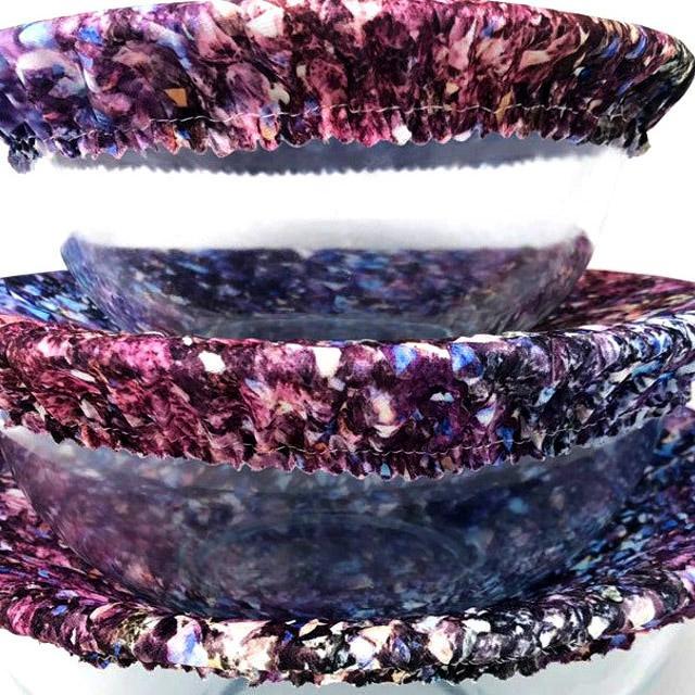 A kaleidoscope of purple crystals adorn this set of 3 bowl covers that replace plastic wrap in your kitchen. Handmade with care using a safe, reusable, machine washable and dryable PUL fabric with elastic edging.