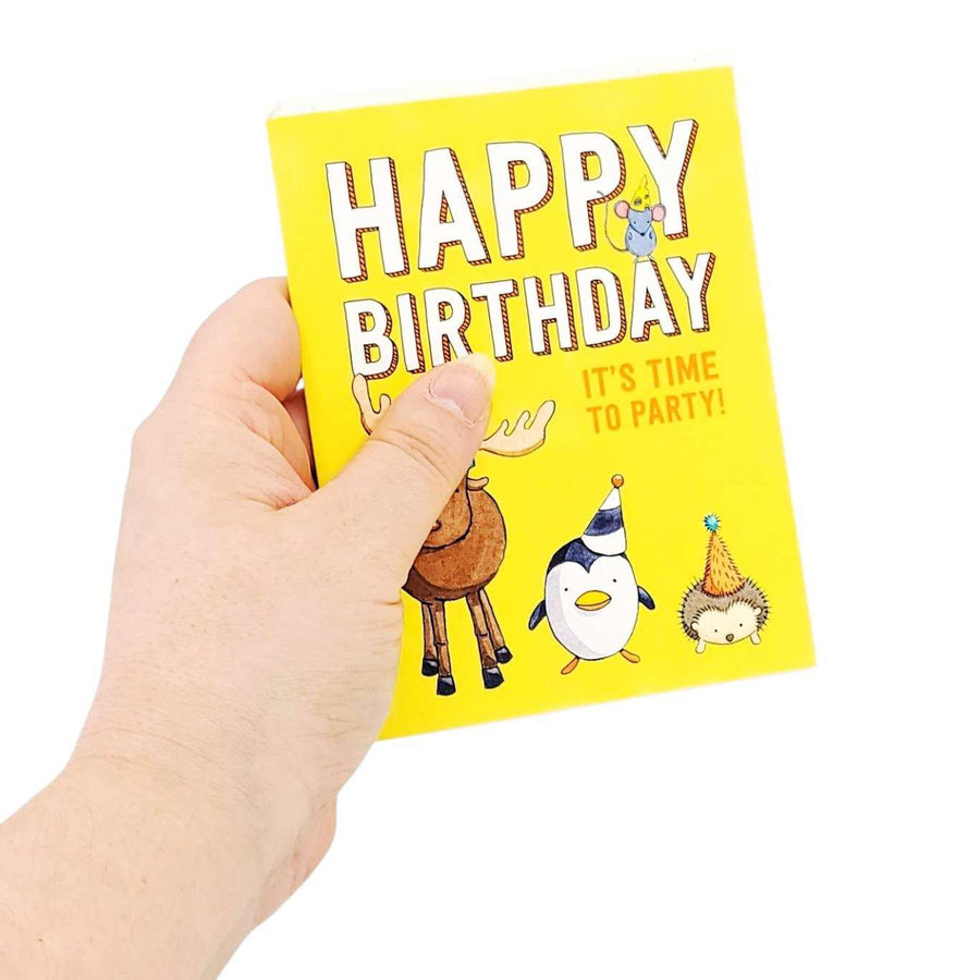 - Yellow card with a moose, a penguin, and a hedgehog all wearing party hats under the text "Happy Birthday" and "It's time to party!"