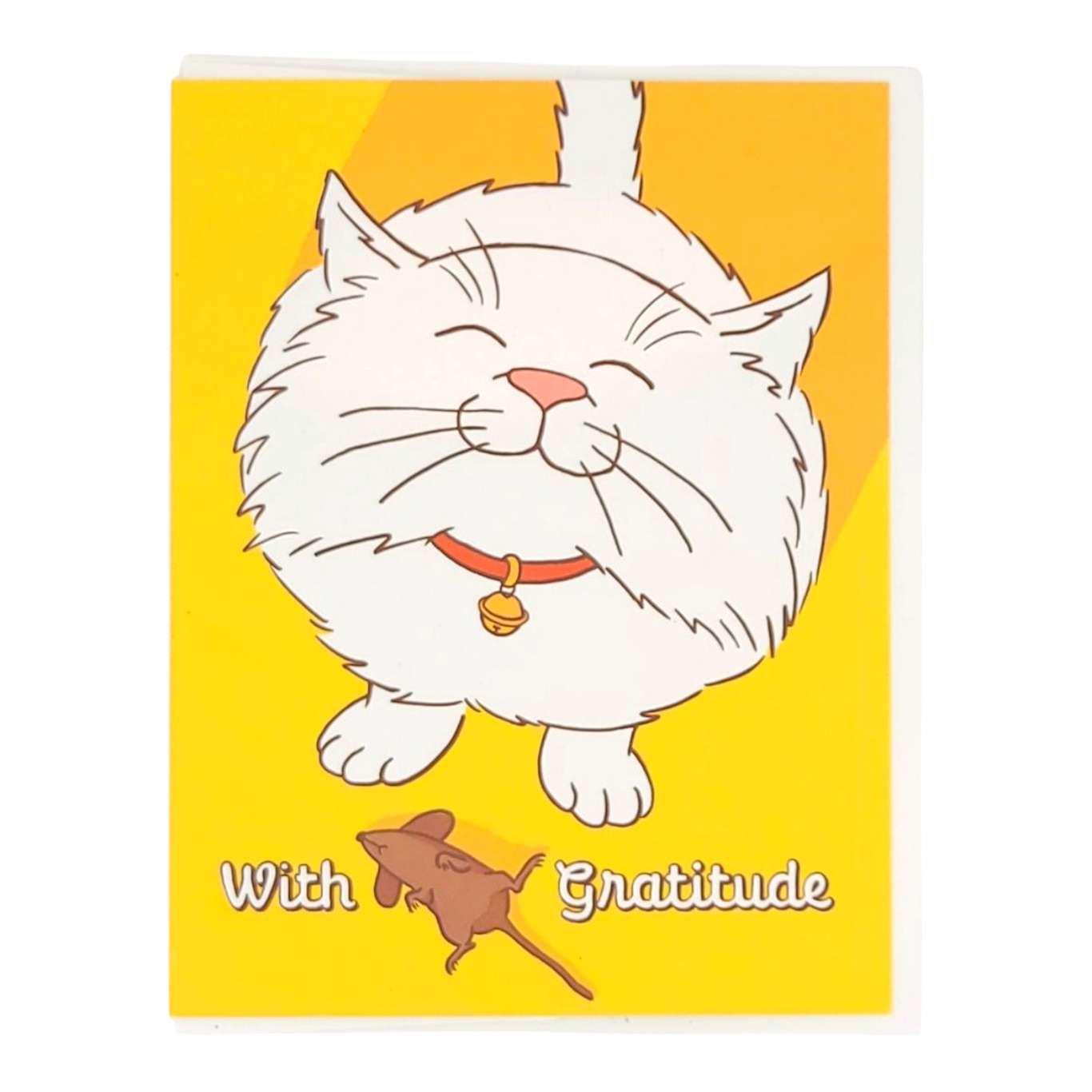 - Yellow card with a white cat standing proudly over a brown mouse between the words "With gratitude"