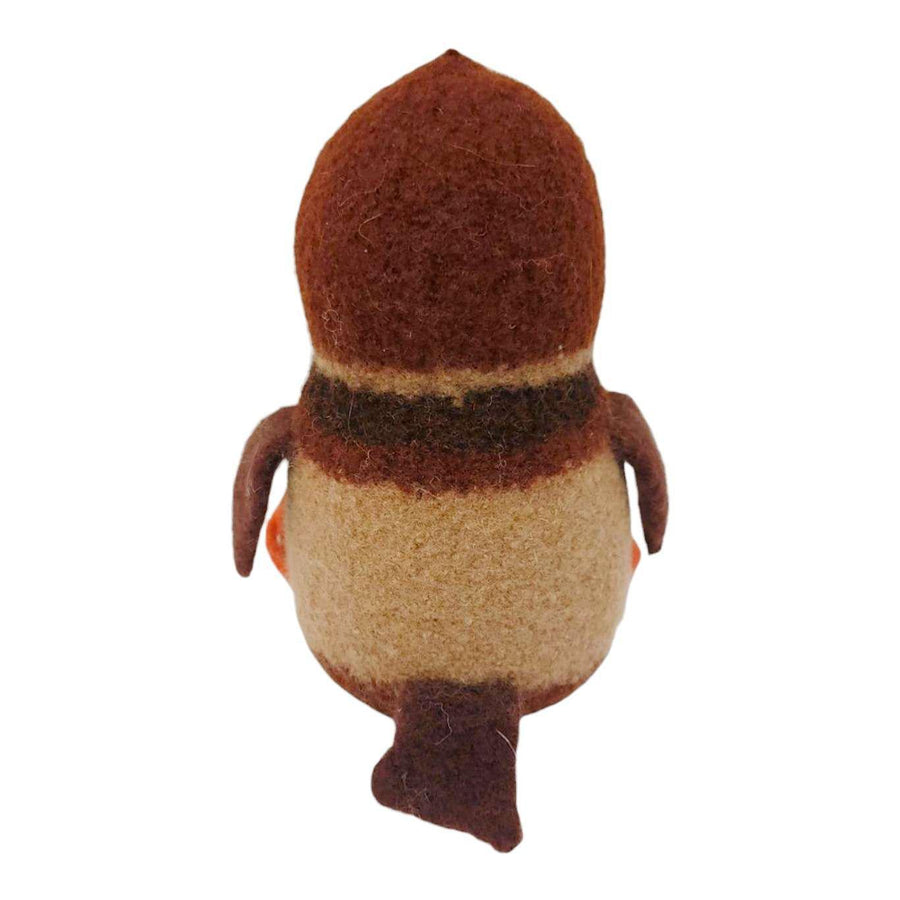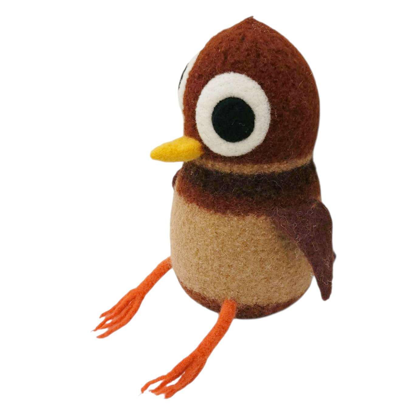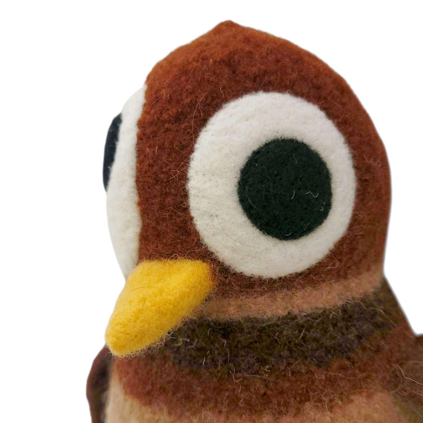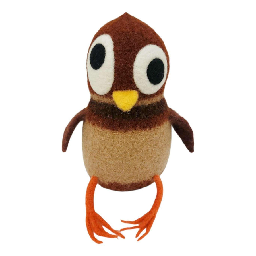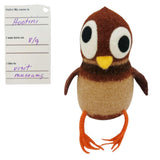 Take home your new owl friend created by Mama Snooter of Snooter-doots! Hand-knit to about 3x its finished size, Mama puts the 100% wool form into a hot soapy washer to shrink and "felt" the knit fabric down to just the right size then stuffs it firmly with new fiberfill. Final details and signature 'Doot eyes are added by needle felting, and a Snooter-doot is born!