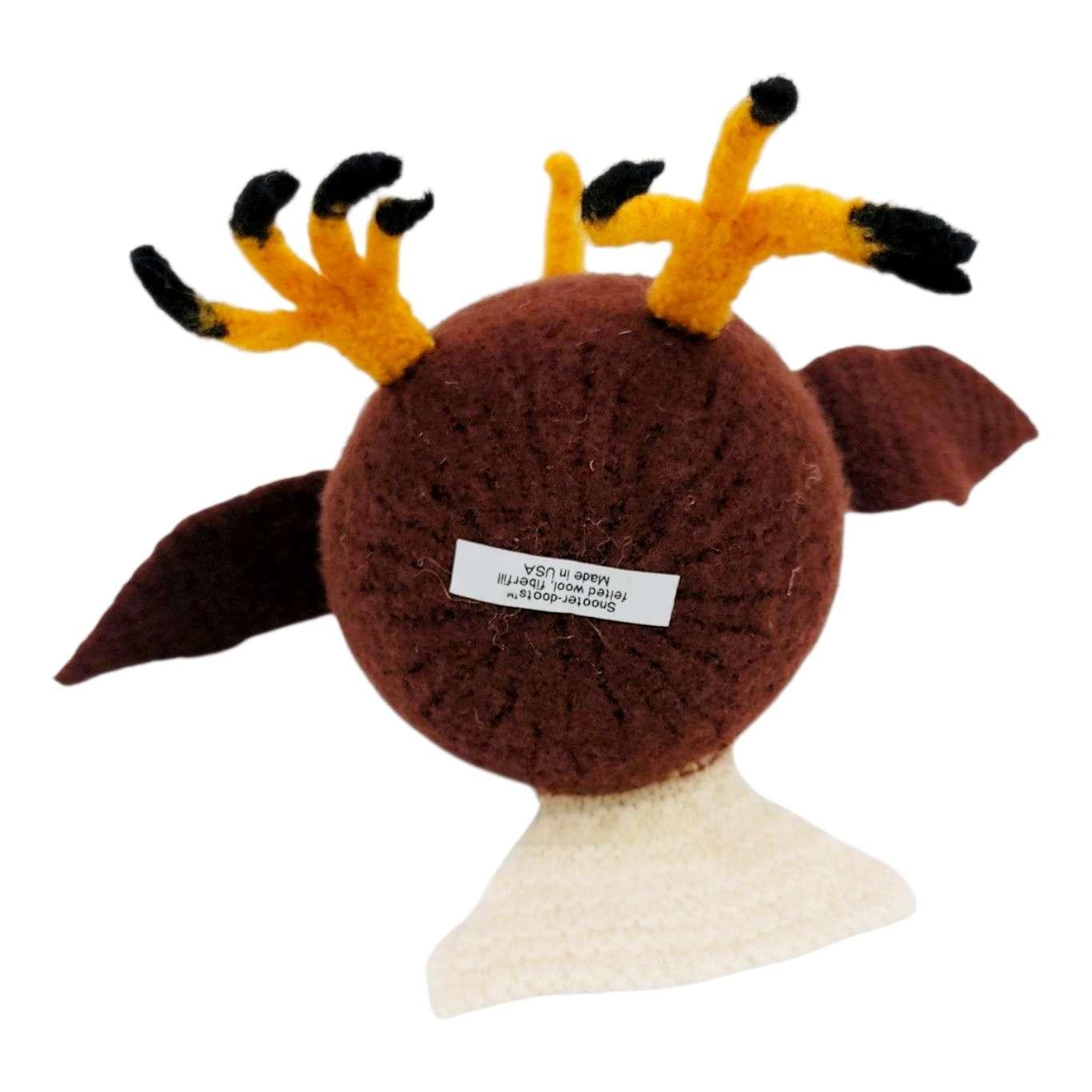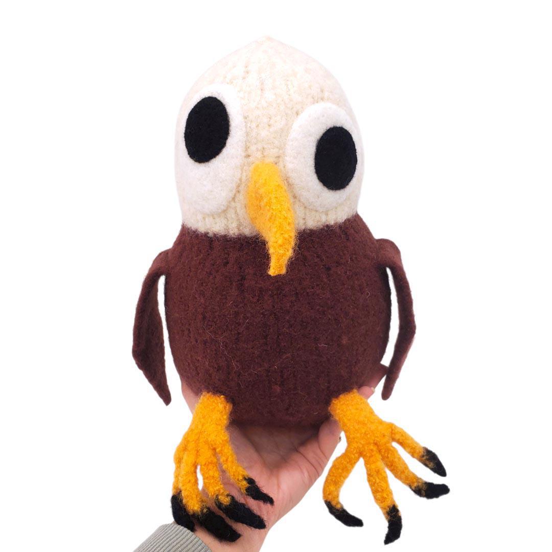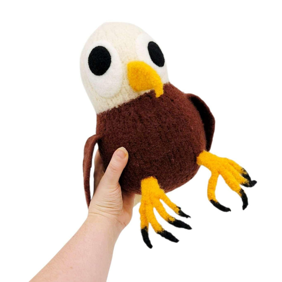 New Eagle friend created by Mama Snooter of Snooter-doots! Hand-knit to about 3x its finished size, Mama puts the 100% wool form into a hot soapy washer to shrink and "felt" the knit fabric down to just the right size then stuffs it firmly with new fiberfill. Final details and signature 'Doot eyes are added by needle felting, and a Snooter-doot is born!