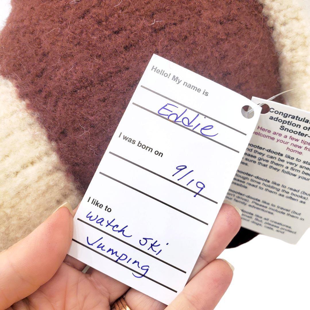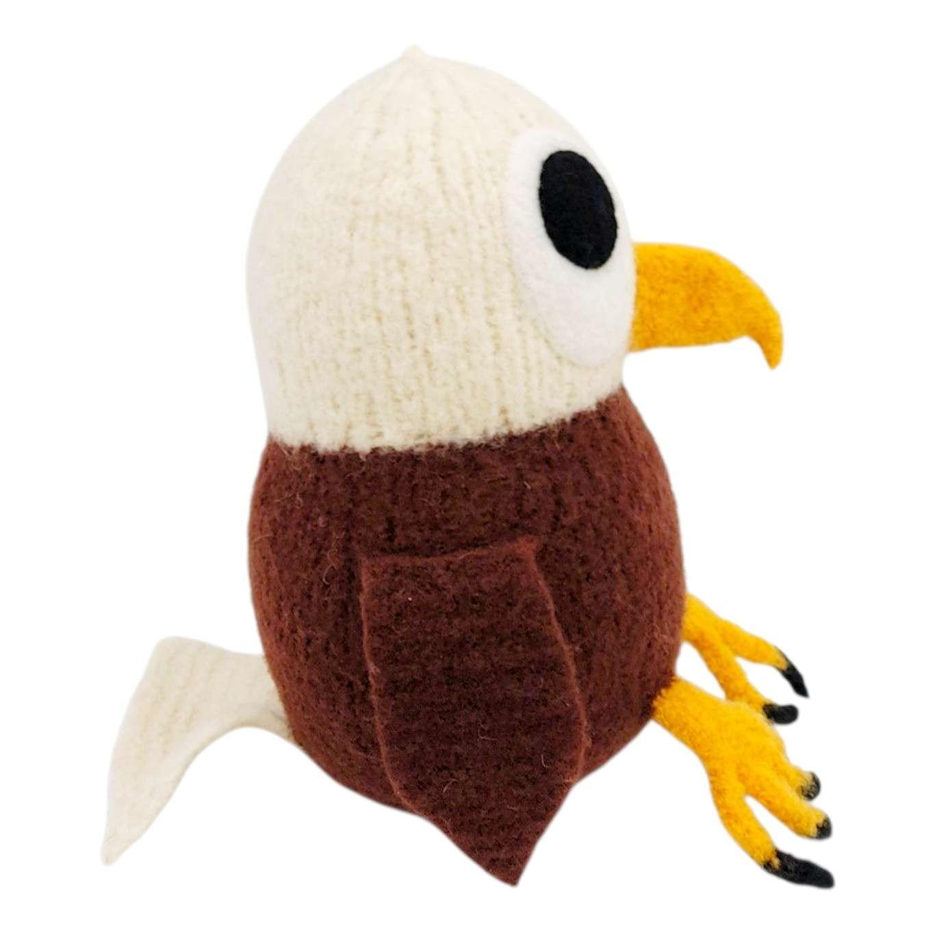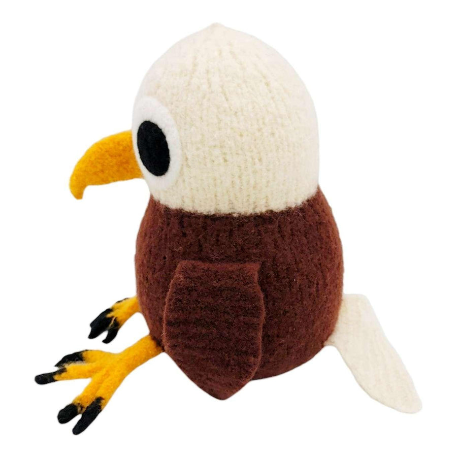 New Eagle friend created by Mama Snooter of Snooter-doots! Hand-knit to about 3x its finished size, Mama puts the 100% wool form into a hot soapy washer to shrink and "felt" the knit fabric down to just the right size then stuffs it firmly with new fiberfill. Final details and signature 'Doot eyes are added by needle felting, and a Snooter-doot is born!