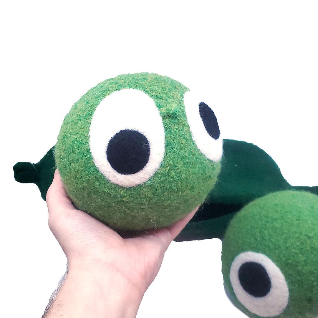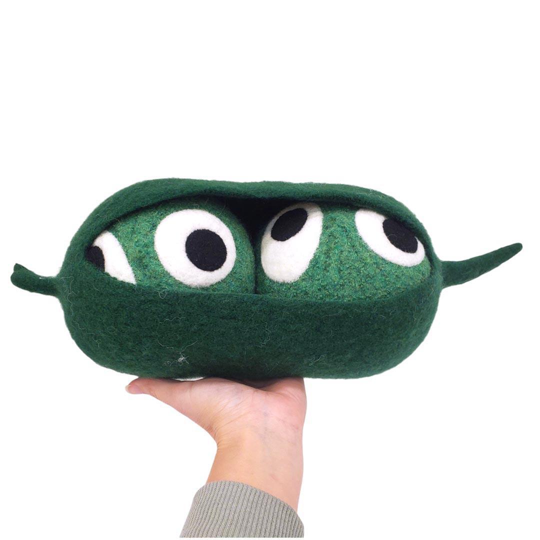 Take home your new friends, two peas in a pod, created by Mama Snooter of Snooter-doots! Hand-knit to about 3x its finished size, Mama puts the 100% wool form into a hot soapy washer to shrink and "felt" the knit fabric down to just the right size then stuffs it firmly with new fiberfill. Final details and signature 'Doot eyes are added by needle felting, and a Snooter-doot is born!