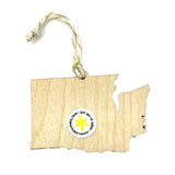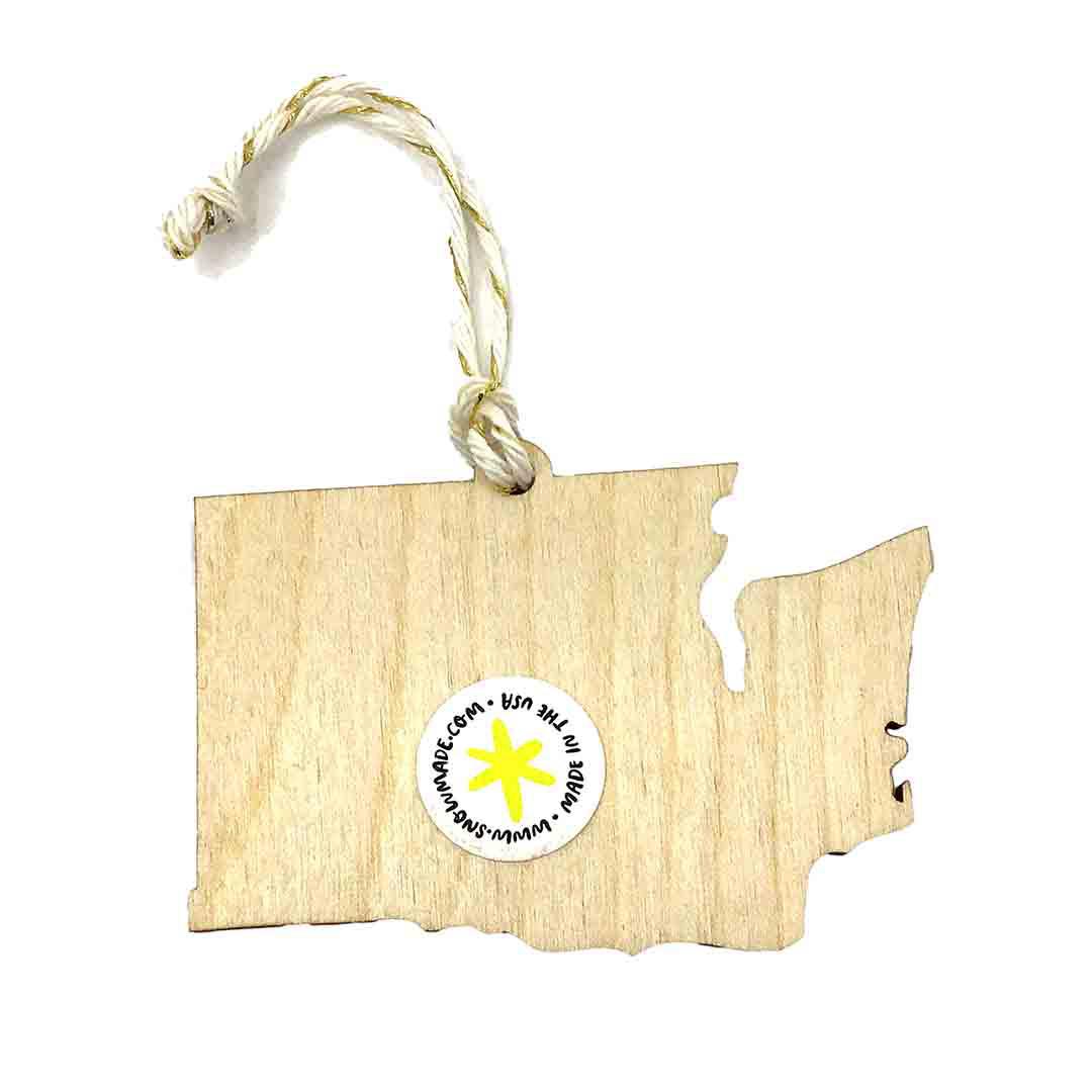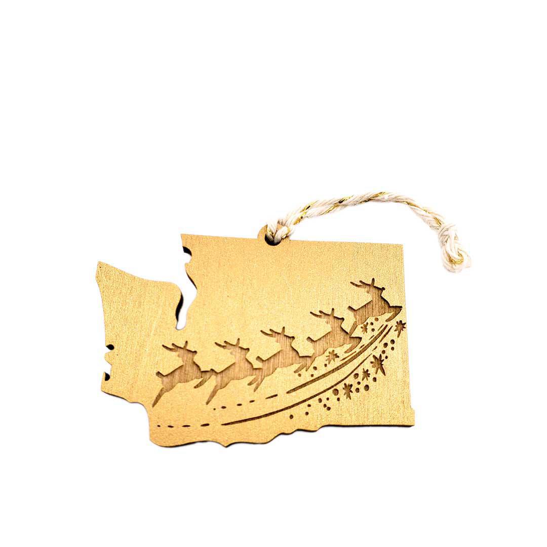 Laser-cut wood in the shape of Washington State with a line of 5 magical reindeer engraved on the front along with a flurry of snowflakes.