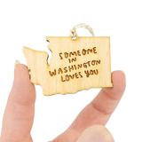 Laser-cut wood in the shape of Washington State with the words “Someone in Washington loves you” engraved on the front.