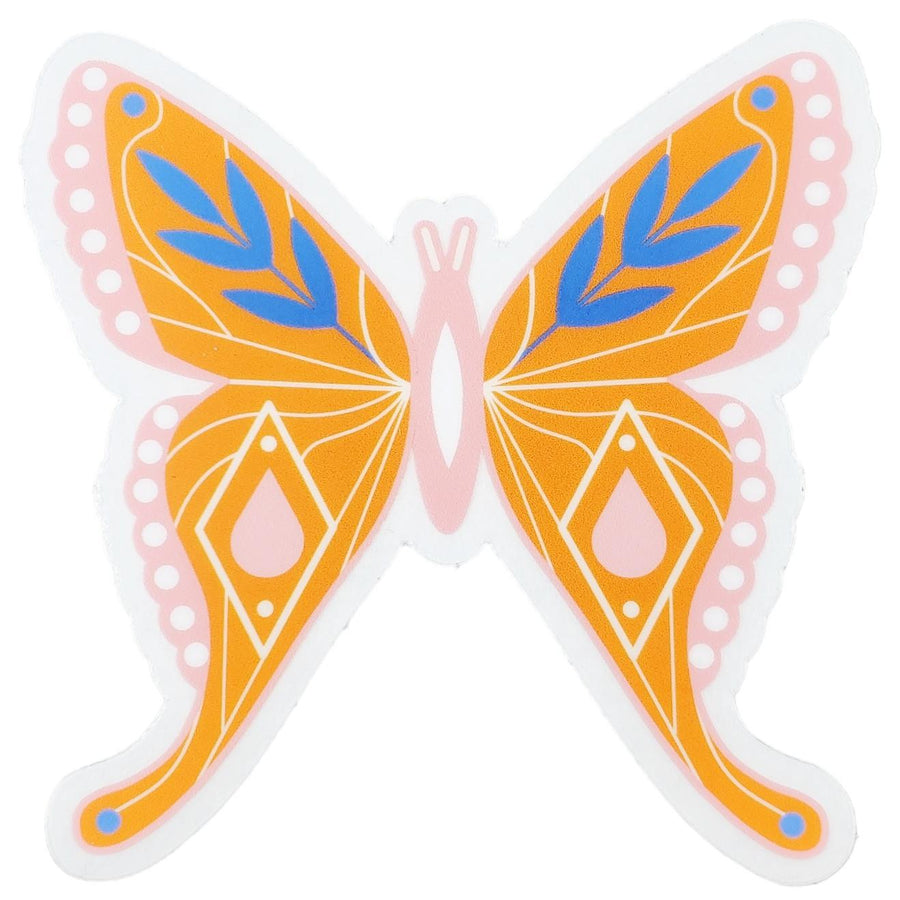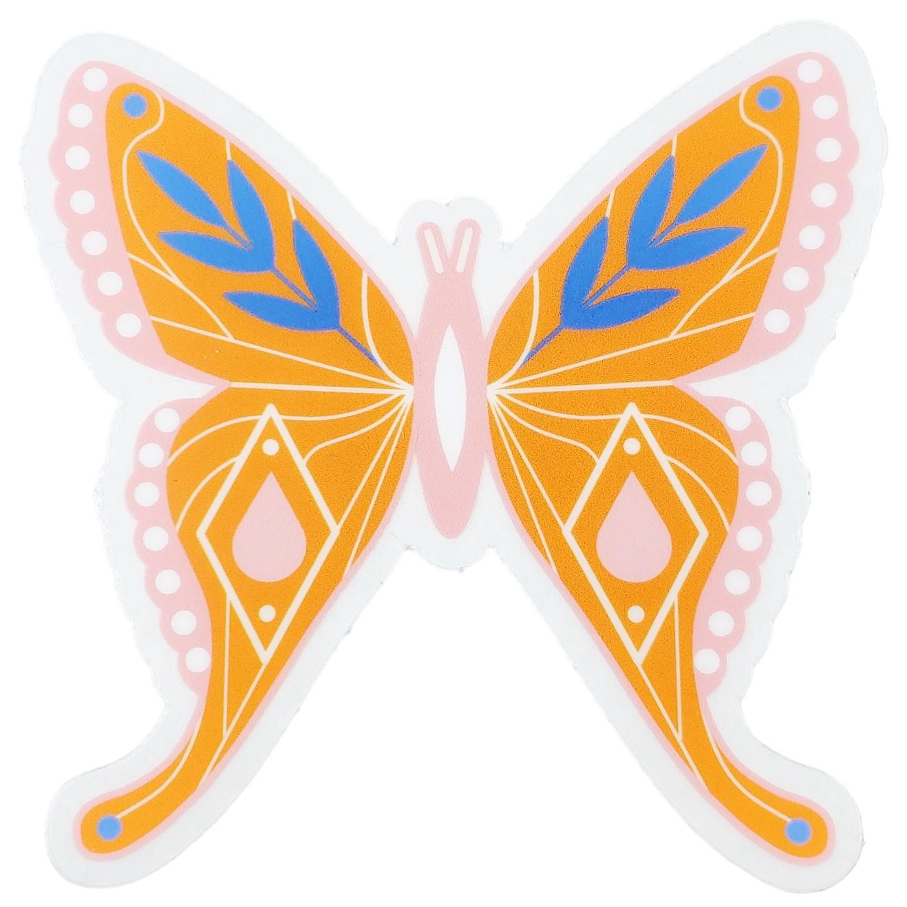 An orange butterfly is illustrated in Amber Leaders' signature mid-century modern style on clear weatherproof and waterproof vinyl. Put them on water bottles, skateboards, laptops, notebooks, basically whatever you like! These stickers make a great gift too!