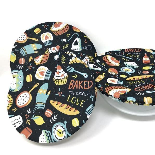 Set of 3 bowl covers with whimsical baked goods illustrations are made to replace plastic wrap in your kitchen. Handmade with care using a safe, reusable, machine washable and dryable PUL fabric with elastic edging.