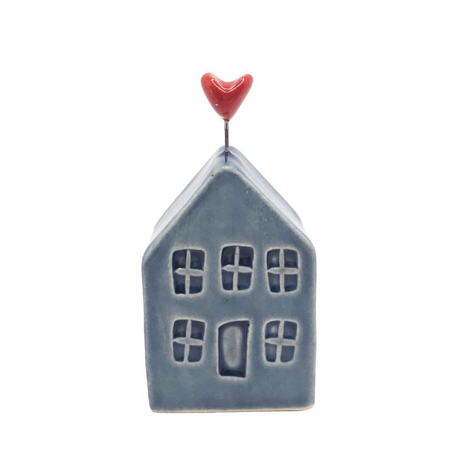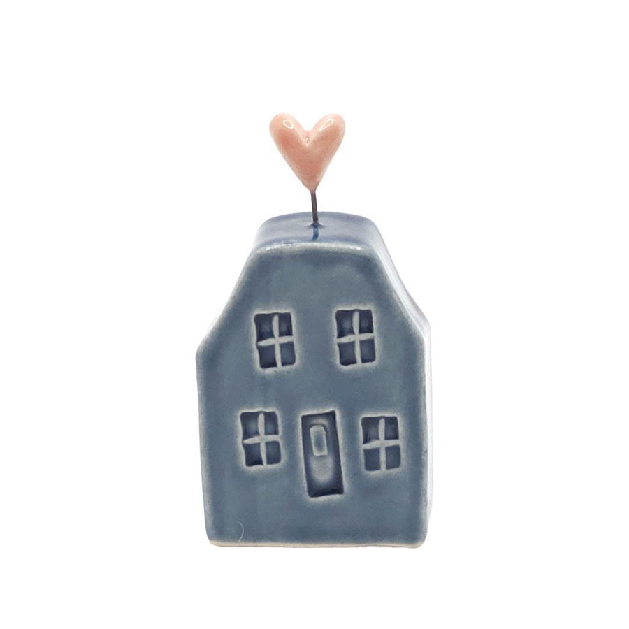 Tiny collectible ceramic houses in a lovely teal glaze, each with a heart floating above its roof.