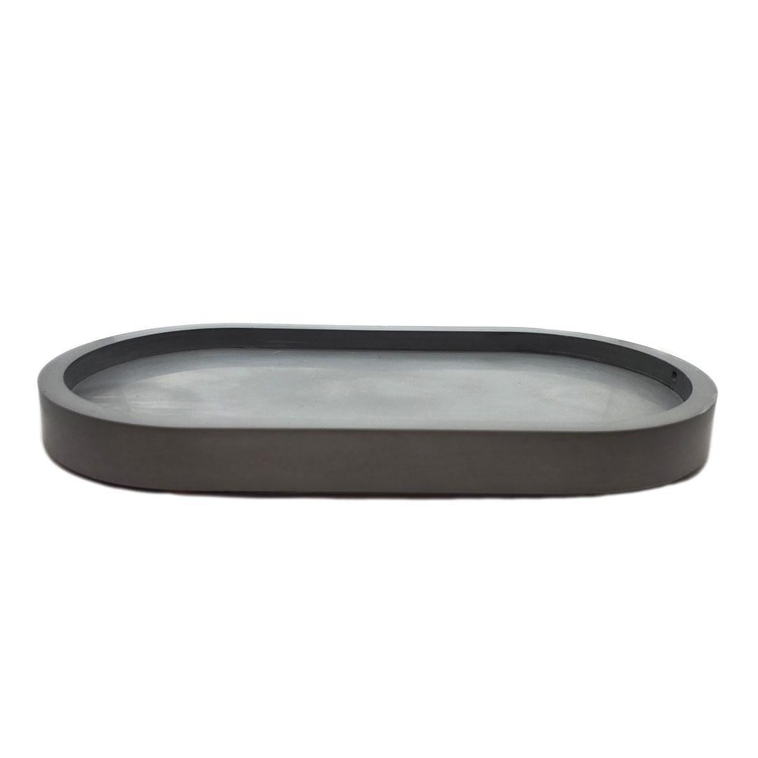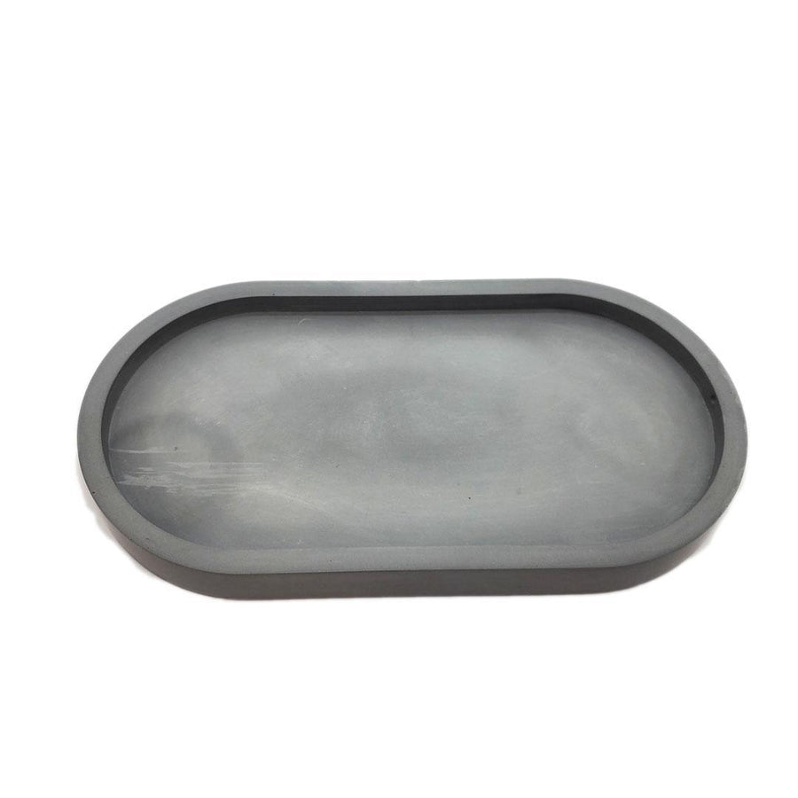 - Hand-poured concrete tray in an elegant pill-inspired oval shape