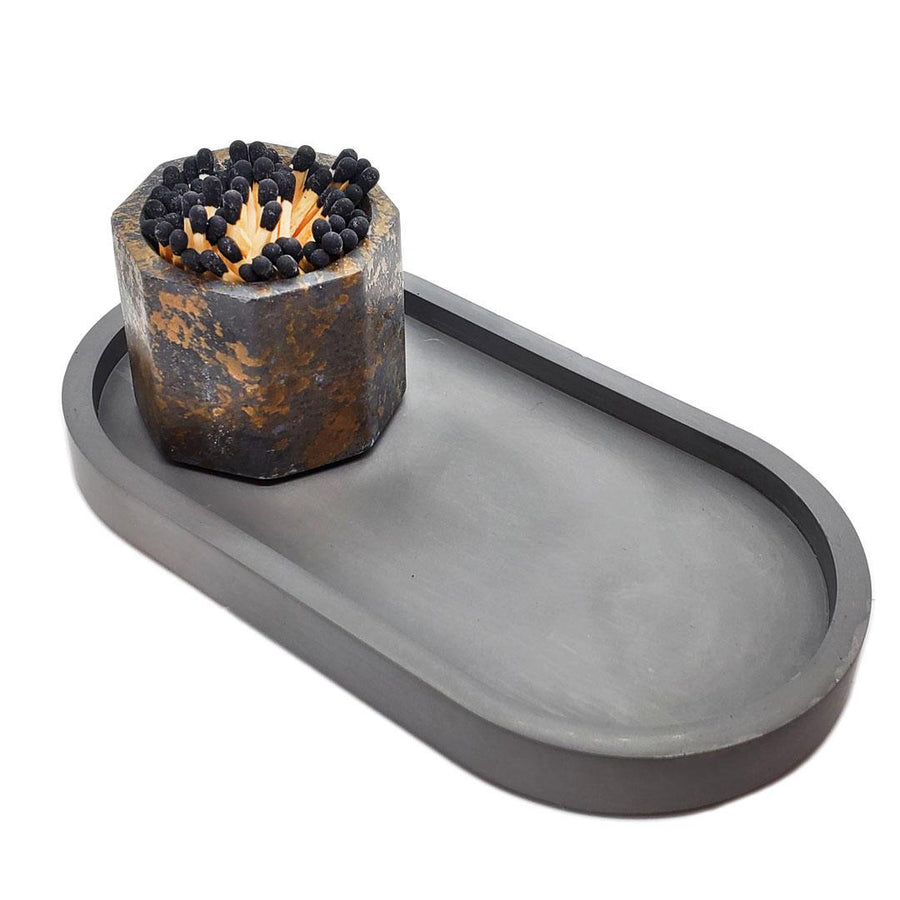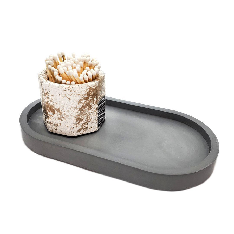 This small gray concrete tray is styled after a pill with its smooth minimalist curves. Perfect as a base for a coordinating concrete match holder and candle, or use it as a catch-all tray wherever you need a little more organization.