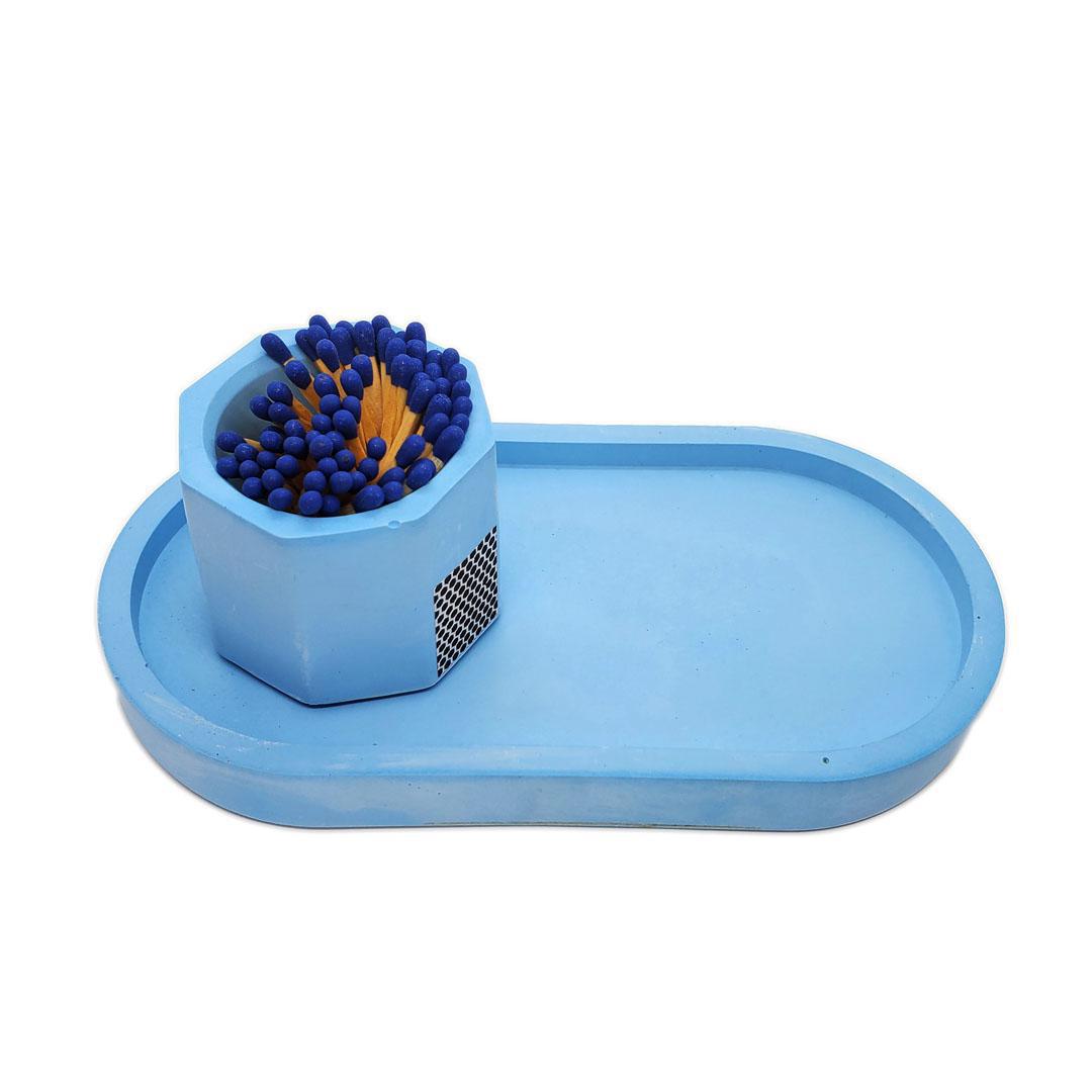 This small sky blue concrete tray is styled after a pill with its smooth minimalist curves. Perfect as a base for a coordinating concrete match holder and candle, or use it as a catch-all tray wherever you need a little more organization.