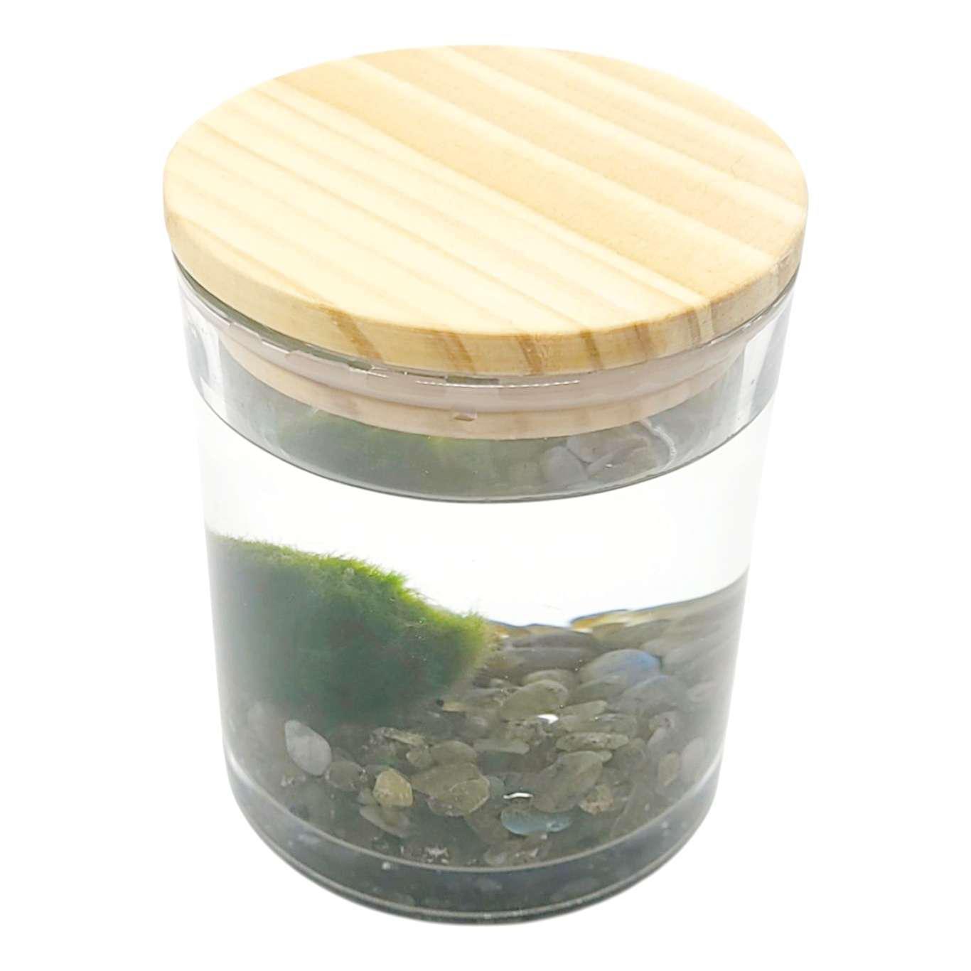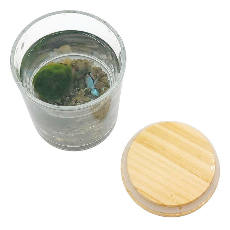 - Materials: Labradorite chips, live moss, glass bottle, wood lid