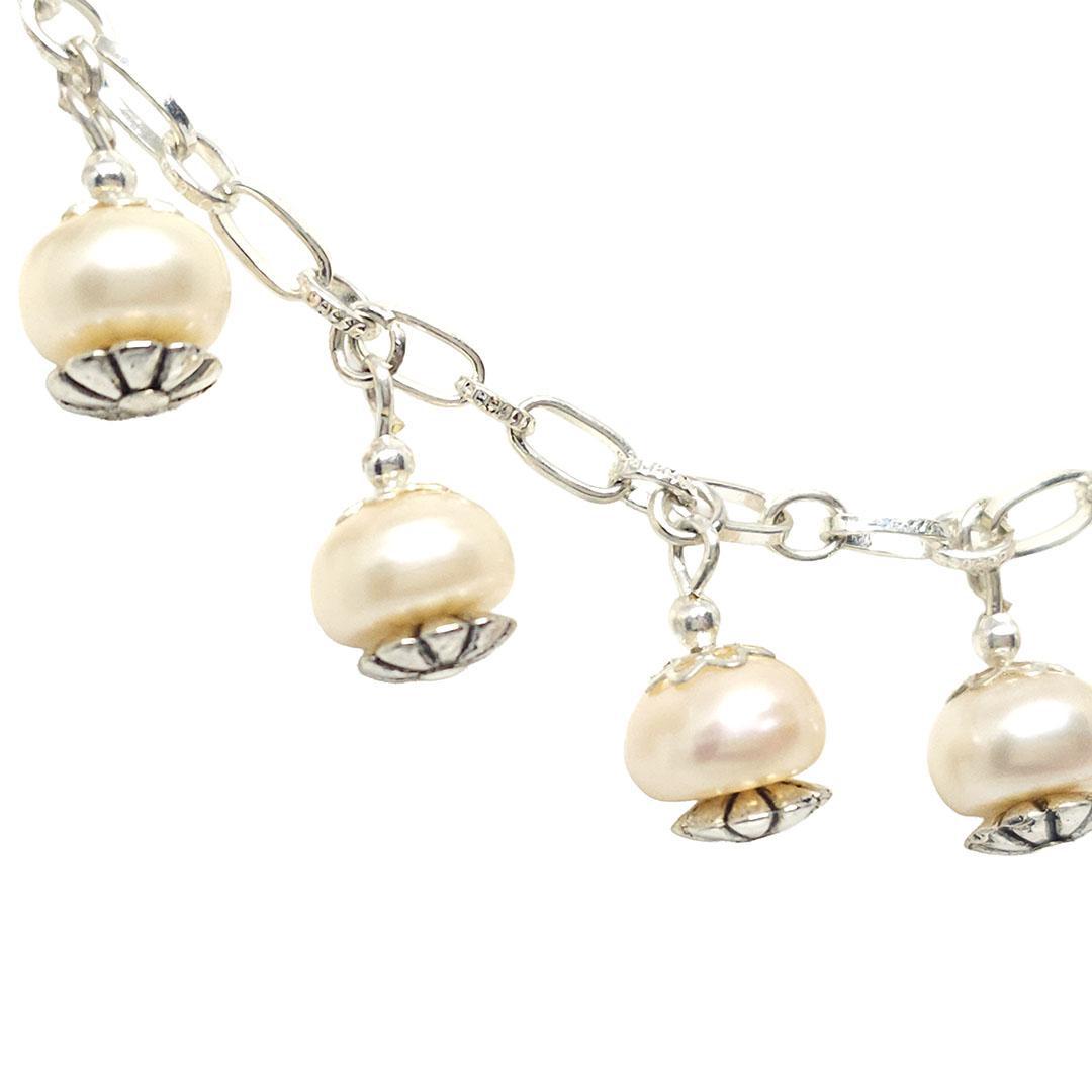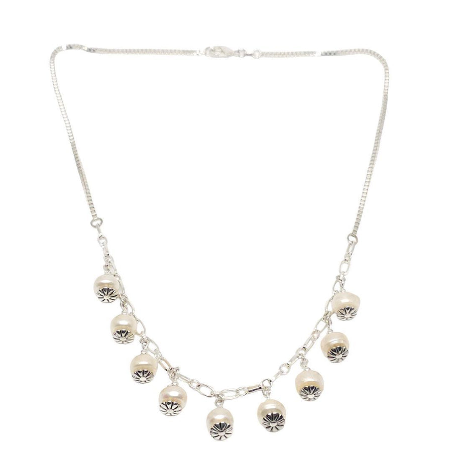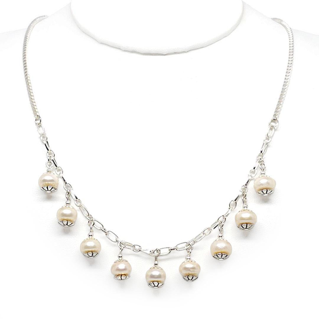 Nine cream-colored freshwater pearls hang from a silver plate chain to create a soft, shimmering focal section. The pearls have a gentle 1/2 inch drop that adds movement without feeling fussy. The center strand spans 6 1/2 inches, and the full necklace measures 18 inches long for an easy everyday fit.