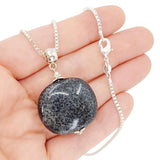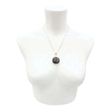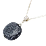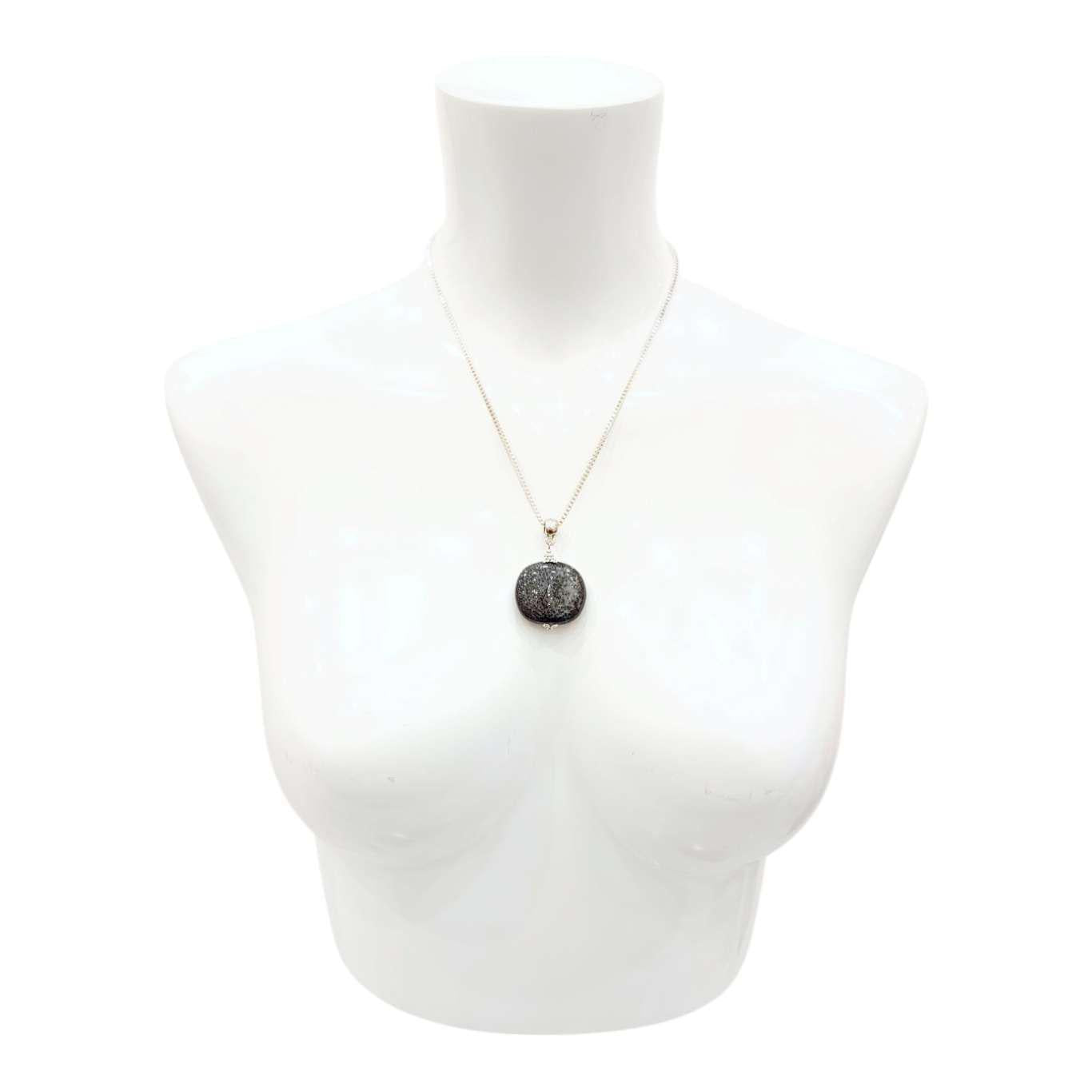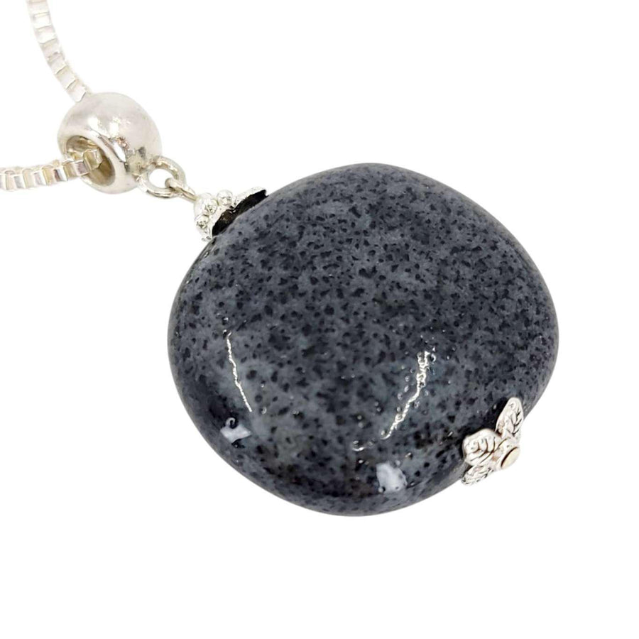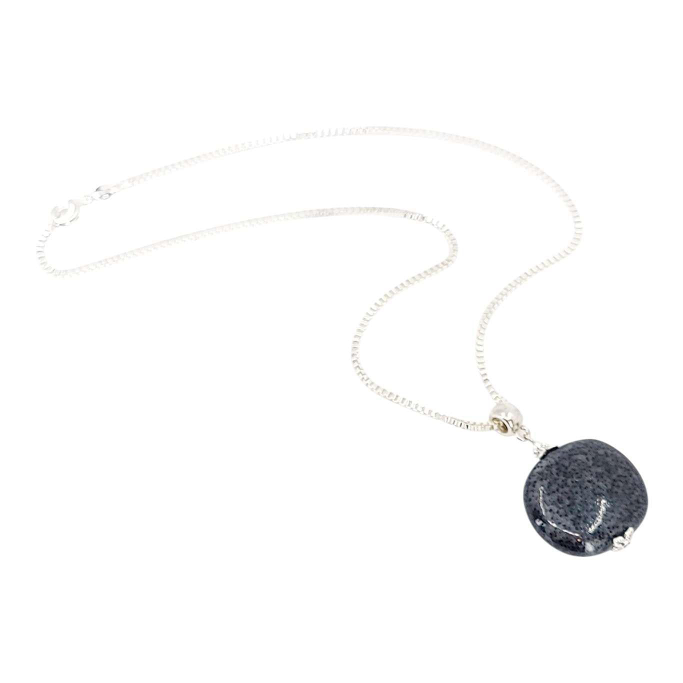 A large pillow-shaped piece of deep gray glazed ceramic with beautiful black spotting hangs on a silver fill box chain.
