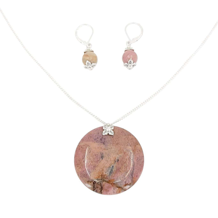 TAN275BUN $66 - Rhodonite Large Stone Coin Pendant Silver Plate Necklace and Earrings Bundle