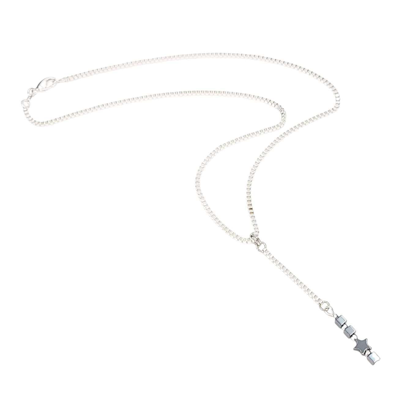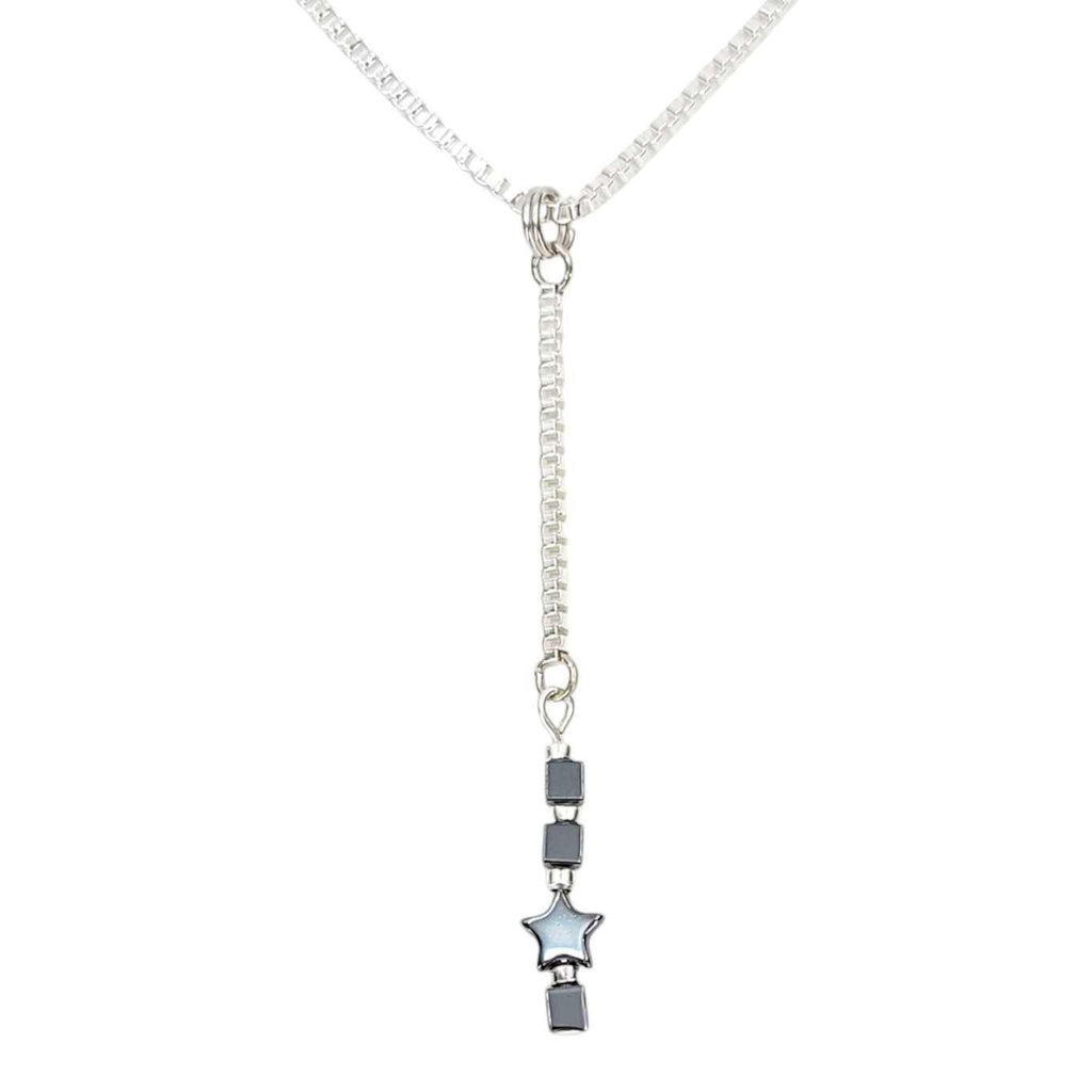 A teeny tiny star framed by cube beads dangles on a long, slender box chain pendant.
