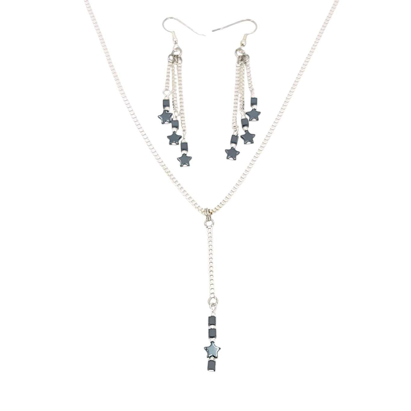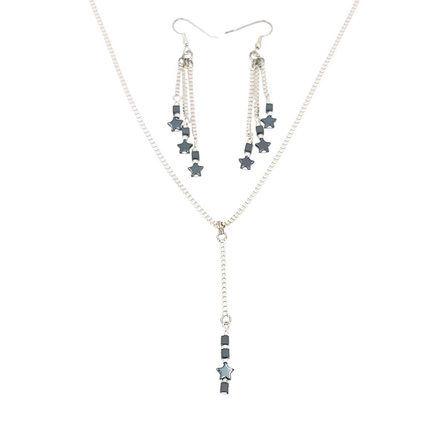 TAN250BUN $50 - Hematite Tiny Star Long Pendant Necklace and Earrings Bundle