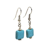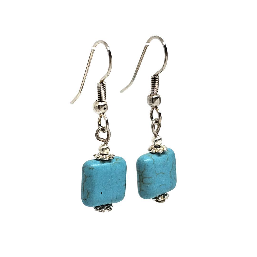 These sweet little earrings feature squares of turquoise-colored howlite on silver-plate ear wires.