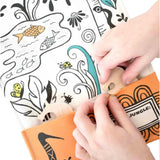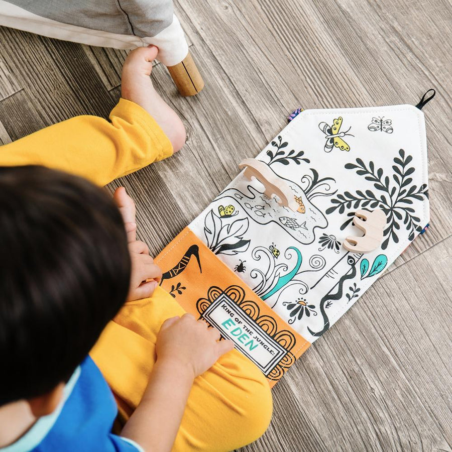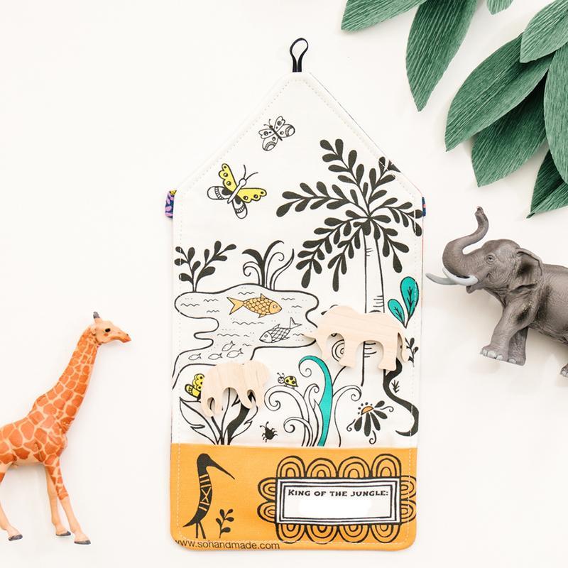 This Jungle-themed playmat is the perfect thing to bring along when your little one needs time for quite play. The hand-sewn playmat has pockets to hold the included wooden animal toys and folds up into a cute carry tote.
