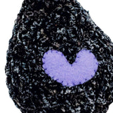 This huggable chunky crocheted chicken is the cutest plush friend with its soft speckled black body, orange comb, and purple heart.