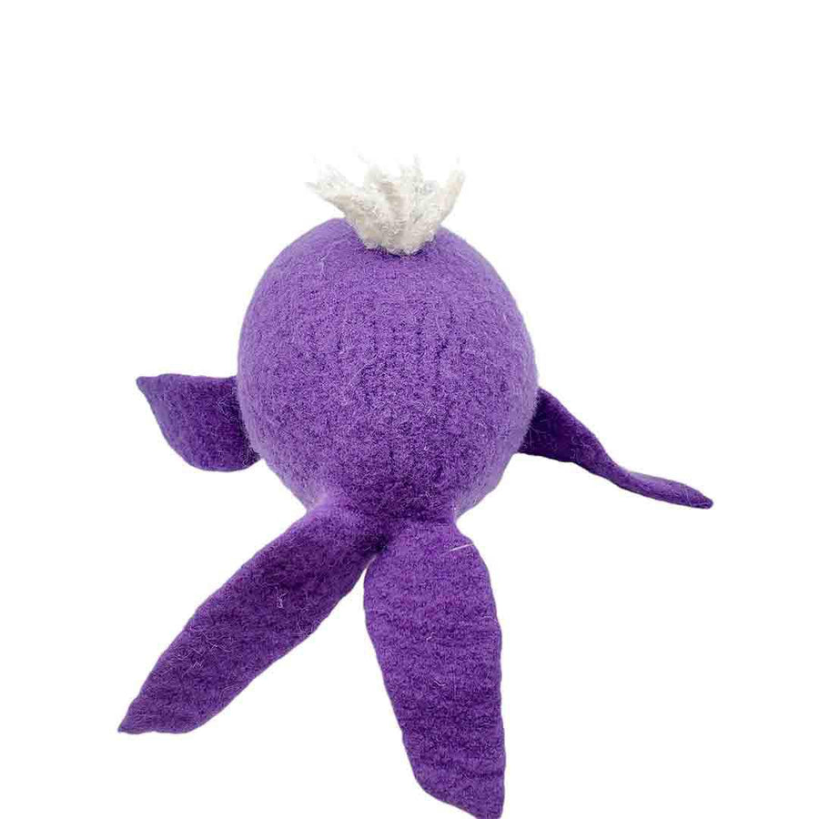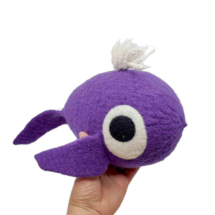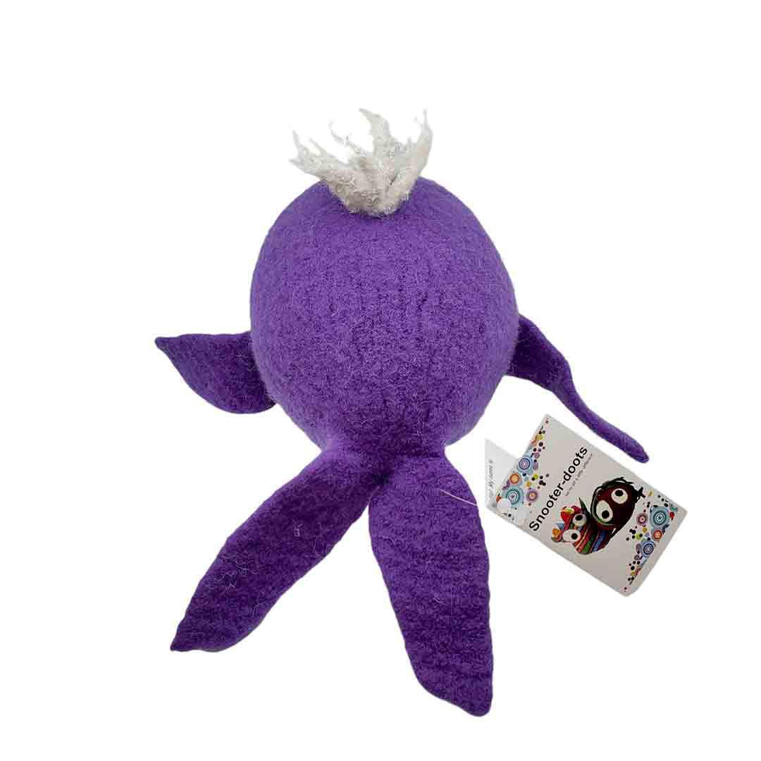 Take home your new whale friend created by Mama Snooter of Snooter-doots! Hand-knit to about 3x its finished size, Mama puts the 100% wool form into a hot soapy washer to shrink and "felt" the knit fabric down to just the right size then stuffs it firmly with new fiberfill. Final details and signature 'Doot eyes are added by needle felting, and a Snooter-doot is born!