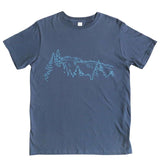 Wear your love for the outdoors on your sleeve - well, on your chest, anyway! A mountain ridge with trees stands proudly across the front of this comfortable cotton shirt. Screen-printed by hand in light blue ink on a blue-gray background. Shirt is made of soft 100% organic cotton and has a loose straight cut shape with a crew neck and short sleeves.