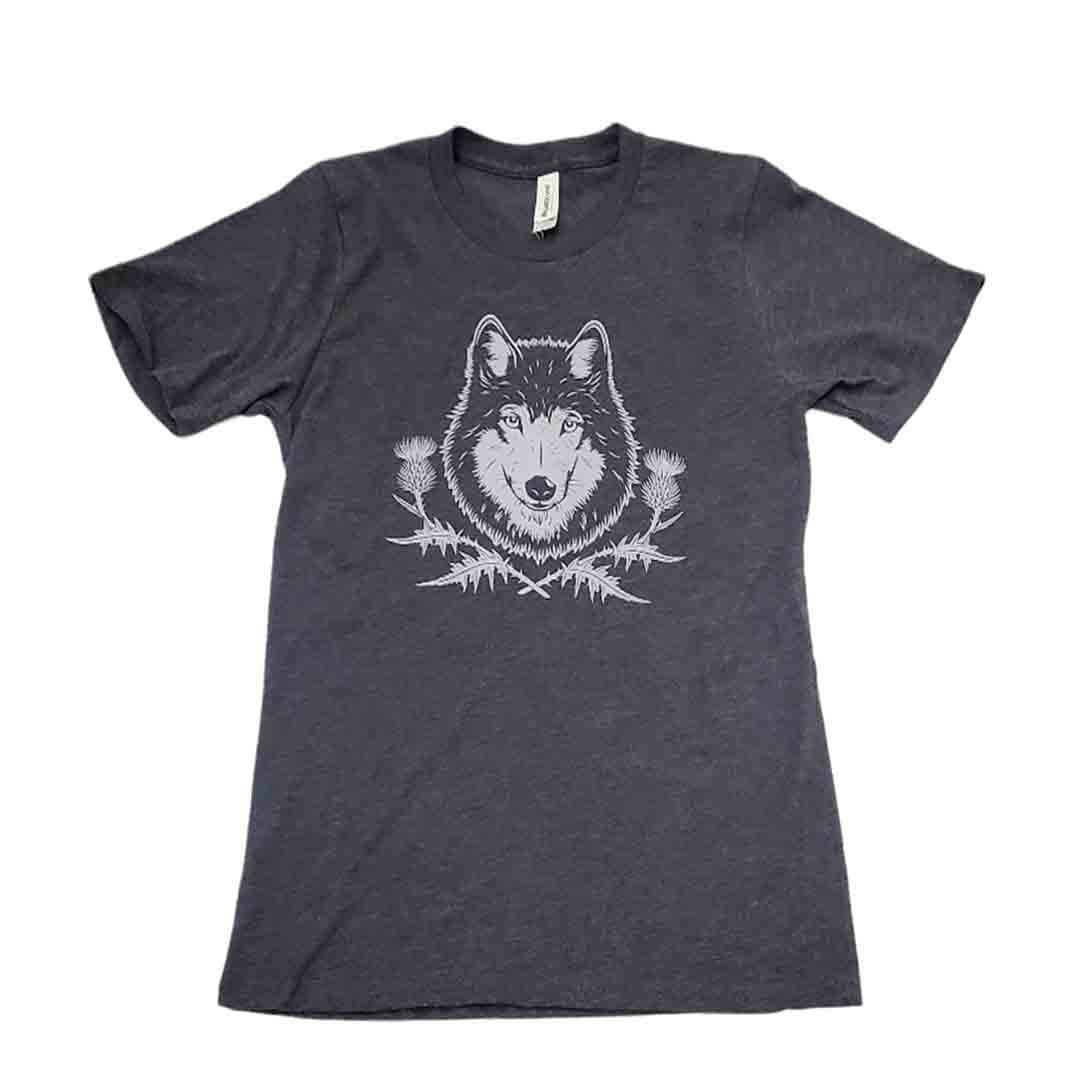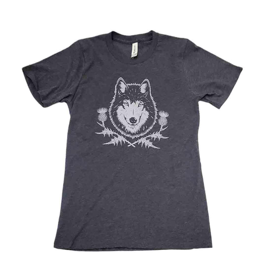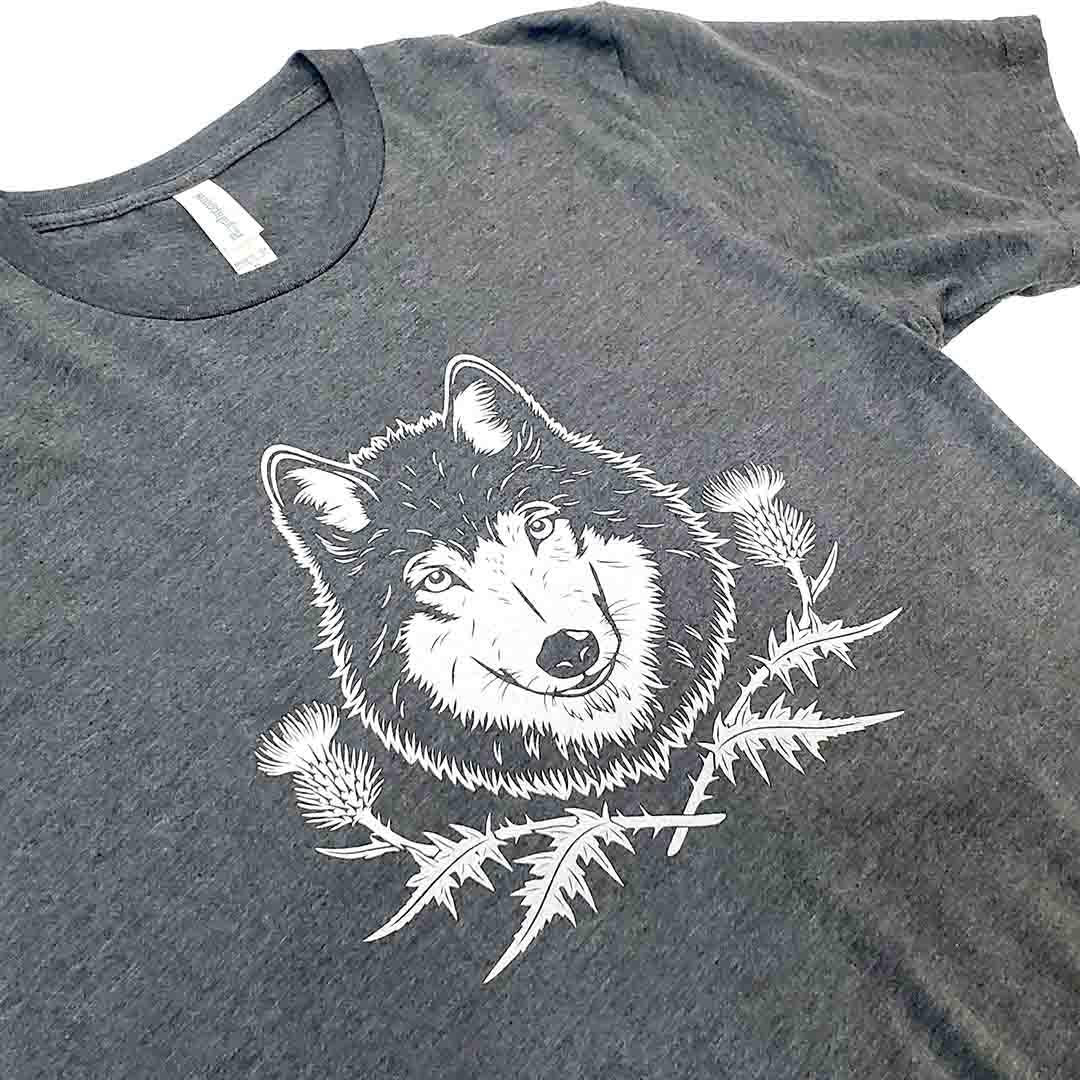A noble wolf gazes out from the front of this super comfortable shirt, surrounded by a frame of thistle flowers. Screen-printed by hand in white ink on a heather gray background. Shirt is made of a super soft organic cotton/RPET (a fiber made from recycled plastic bottles) blend and has a slim straight cut shape with a crew neck and short sleeves.