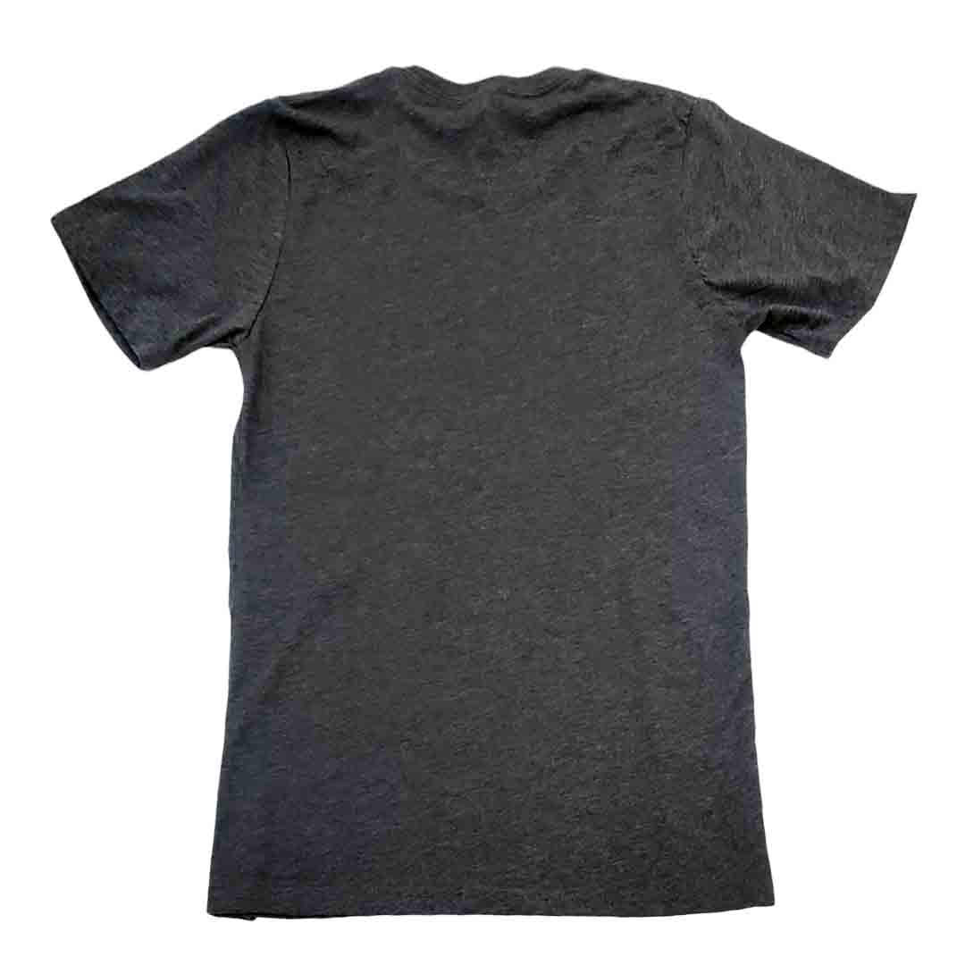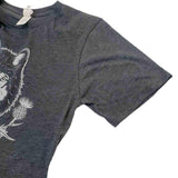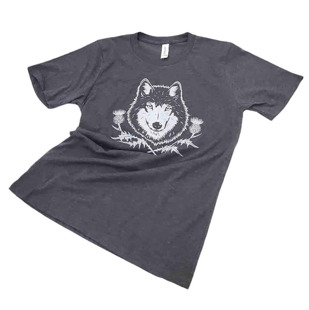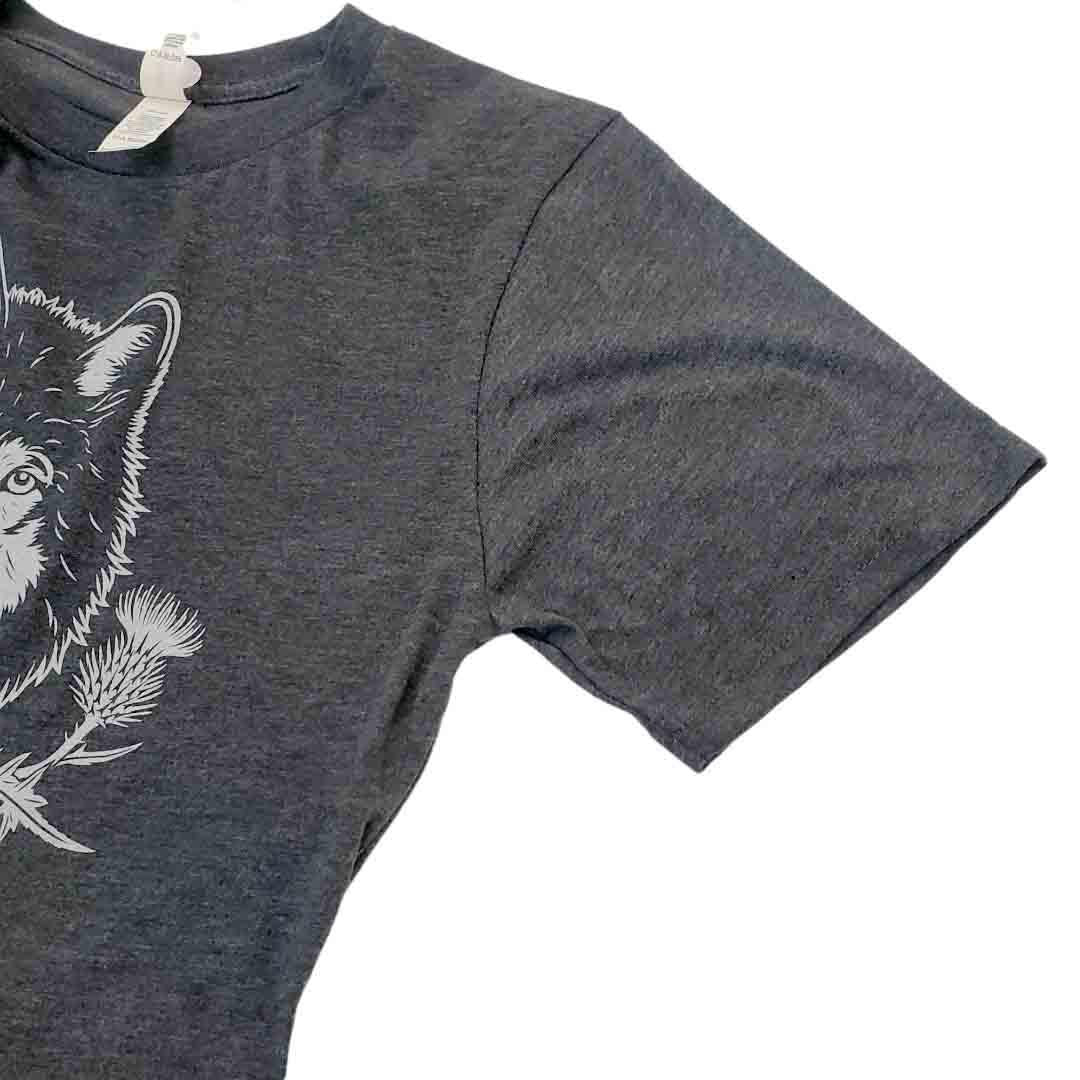 A noble wolf gazes out from the front of this super comfortable shirt, surrounded by a frame of thistle flowers. Screen-printed by hand in white ink on a heather gray background. Shirt is made of a super soft organic cotton/RPET (a fiber made from recycled plastic bottles) blend and has a slim straight cut shape with a crew neck and short sleeves.