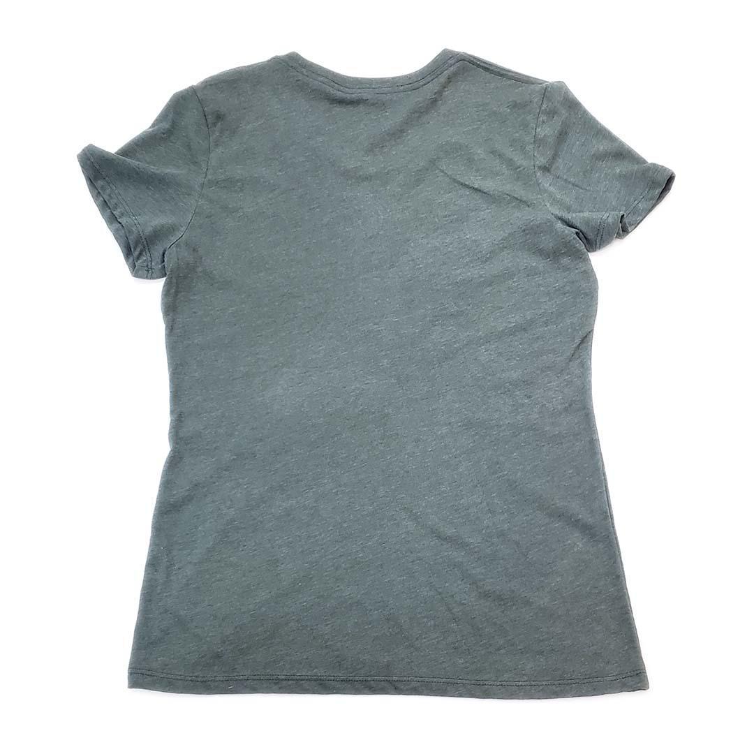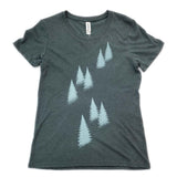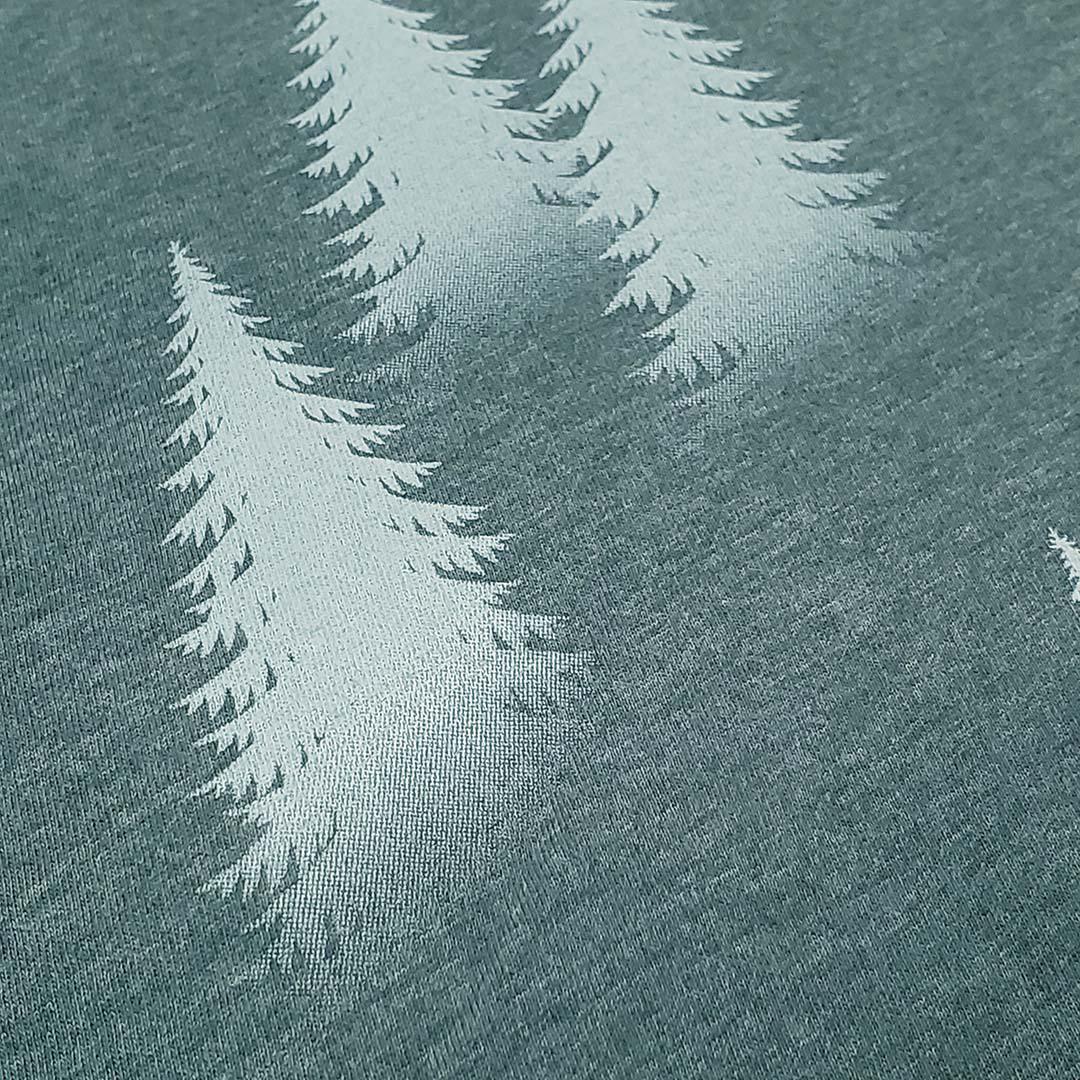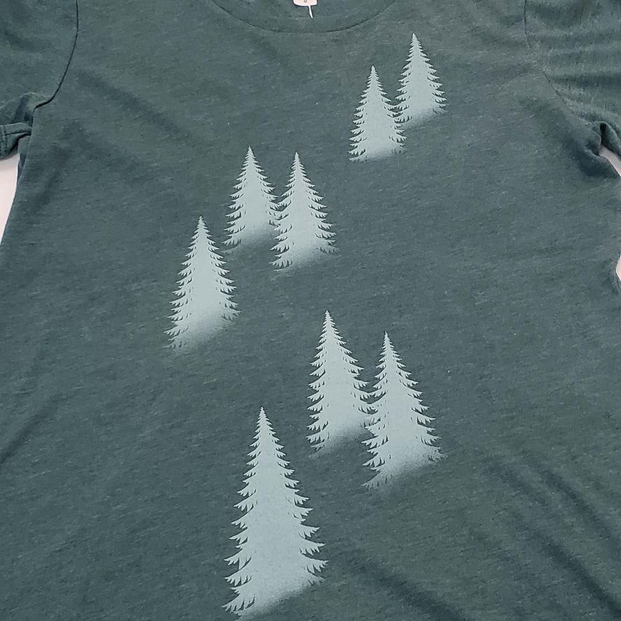 White evergreen trees on a softly heathered forest green, super comfortable shirt.