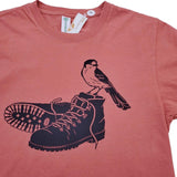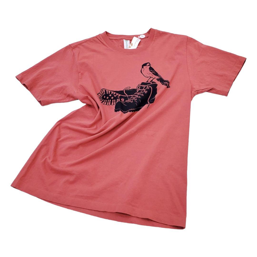 A mountian song bird delicately perches on a pair of hiking boots on the front of this comfortable shirt. Screen-printed by hand in black ink on a light red background.