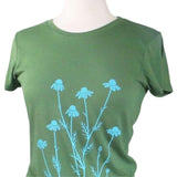 Dainty chamomile flowers sprout up the front of this super comfortable shirt. Screen-printed by hand in light aqua ink on a green background. Shirt is made of a super soft, lightweight organic bamboo/cotton blend and has a slim, slightly contoured shape with a wide crew neck and short sleeves.