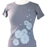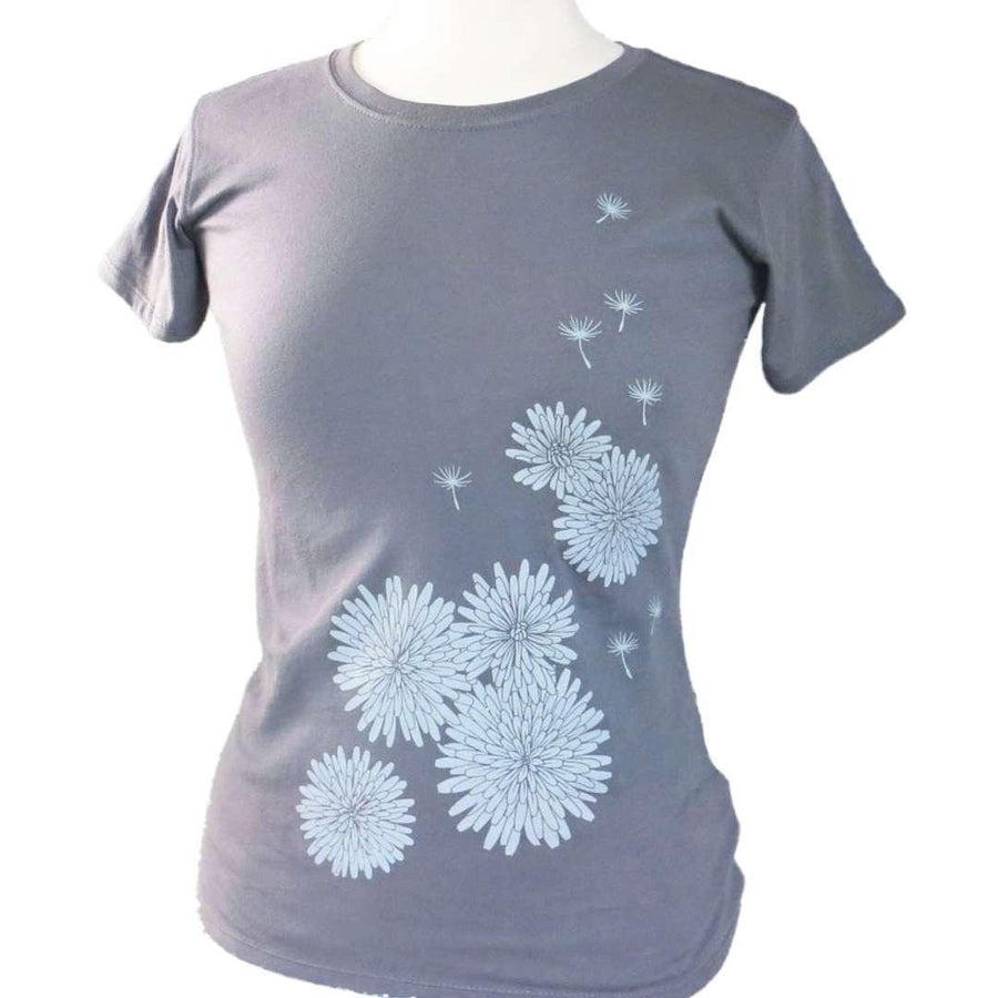 Cheerful dandelion blossoms float up the front of this pretty gray T-shirt. Screen-printed by hand in light gray ink on a dark gray background. Shirt is made of soft, lightweight organic cotton and has a slightly contoured shape with a crew neck and short sleeves.