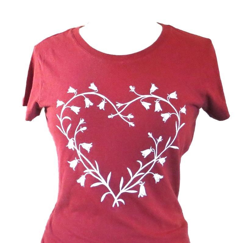 Delicate bluebells curl around to form a heart shape on the front of this cute, comfortable shirt. Screen-printed by hand in light pink ink on a red background. Shirt is made of a soft hemp/organic cotton blend and has a contoured shape with a wide crew neck and short sleeves.