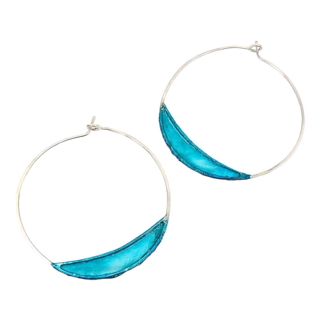 Sterling silver hoop earrings, hammered by hand to achieve a dappled bright texture, with a window of handmade tinted paper and coated in resin.