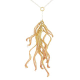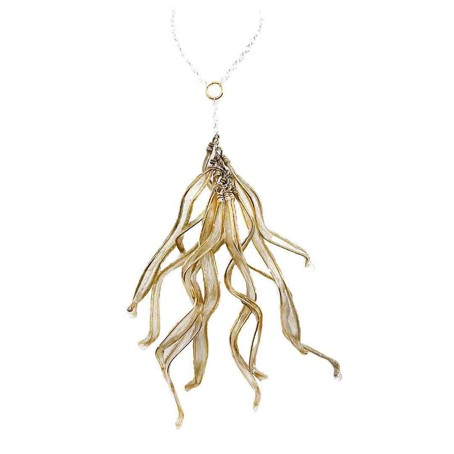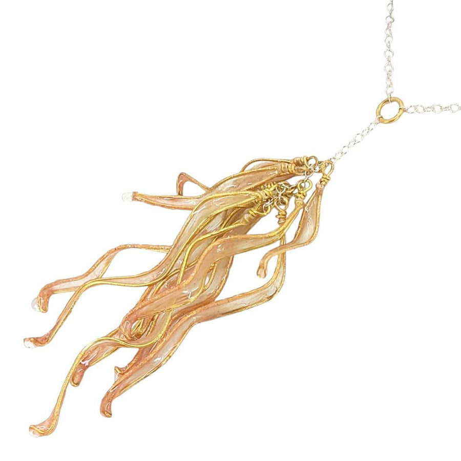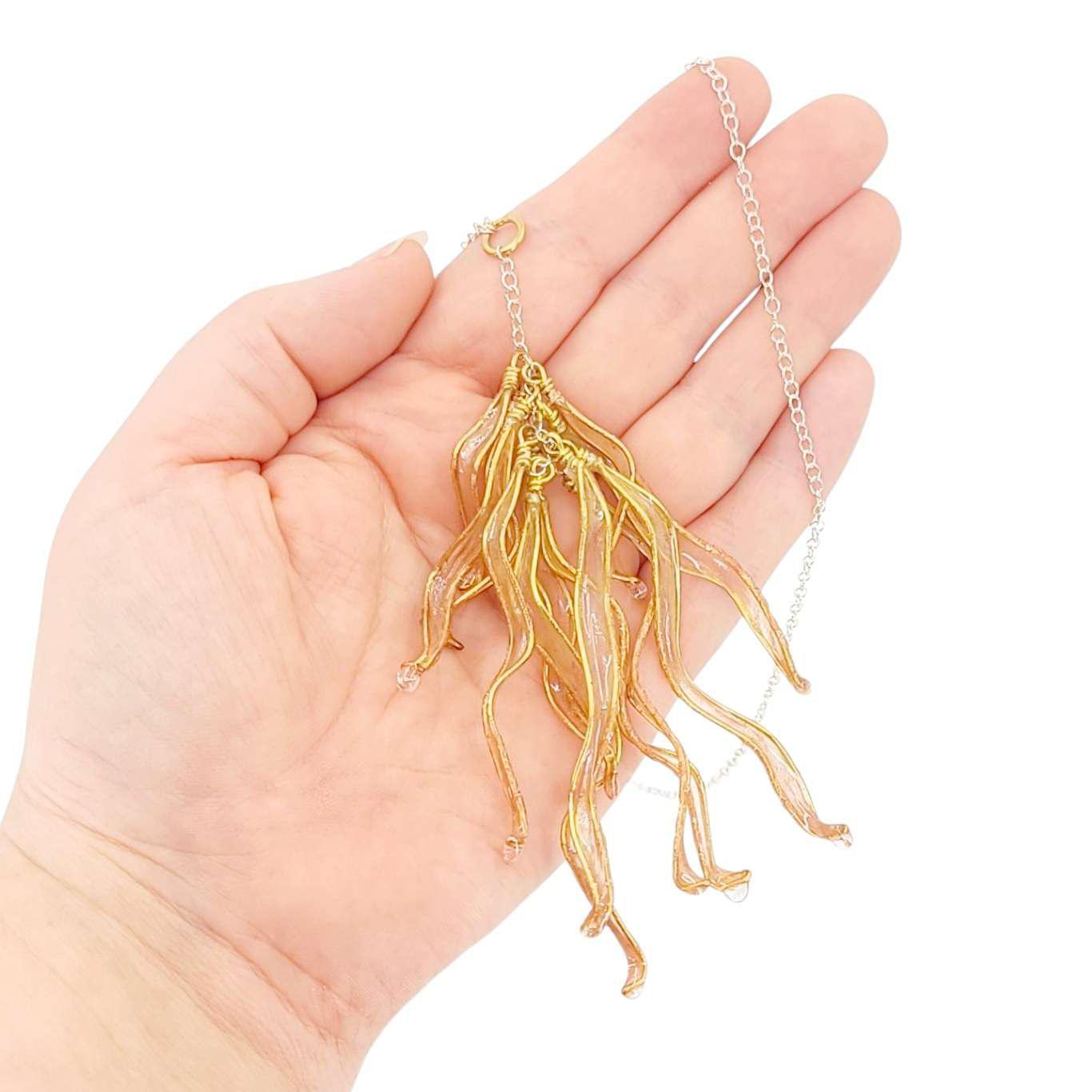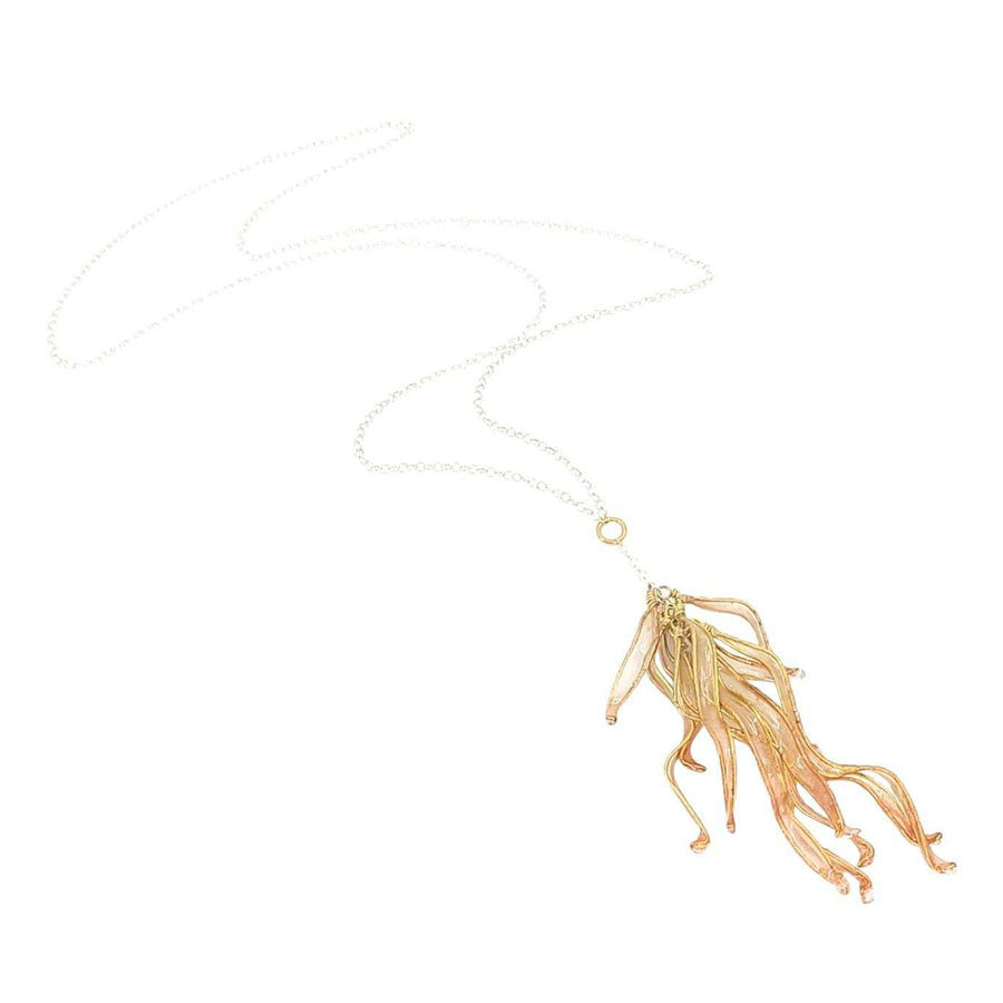 This funky organic statement necklace starts with undulating copper petal forms which are then dipped into an abaca paper fiber solution. After multiple layers of paper are dried, the artist hand-dyes the paper with gradient color and then seals everything with crystal clear resin to protect and waterproof.