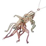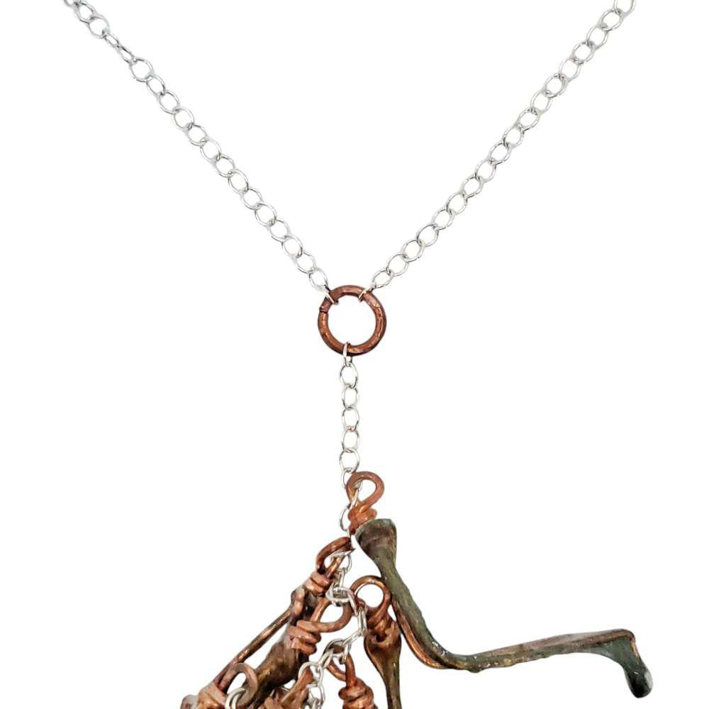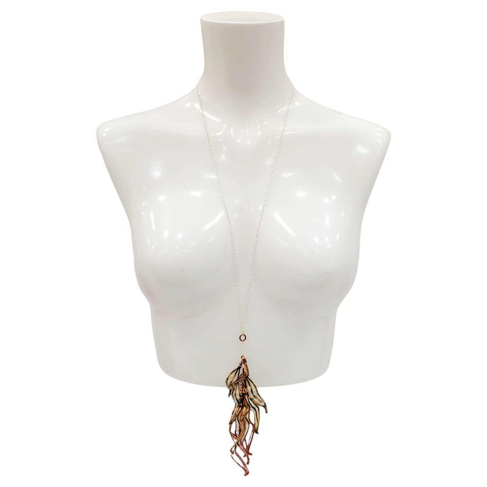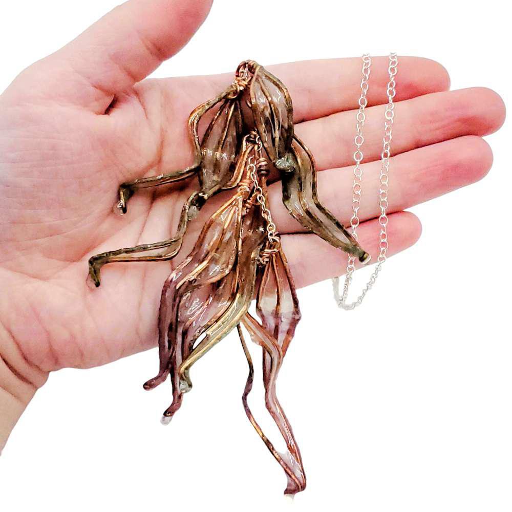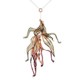 This funky organic statement necklace starts with copper leaf forms which are then dipped into an abaca paper fiber solution. After multiple layers of paper are dried, the artist hand-dyes the paper with gradient color and then seals everything with crystal clear resin to protect and waterproof.